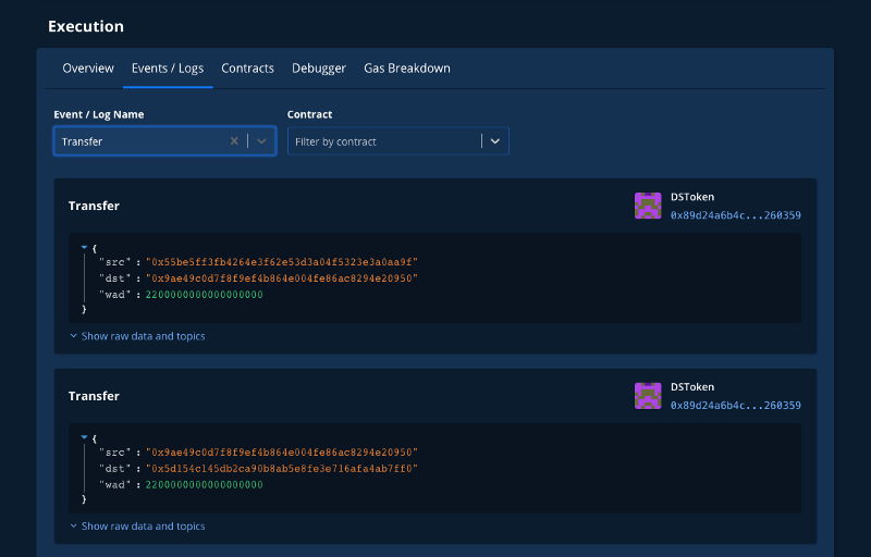 When you open up a transaction (for example this one), you can see all of the Logs that were emitted. Not only that, weāve decoded all of the Logs, so you can easily read the parameters!