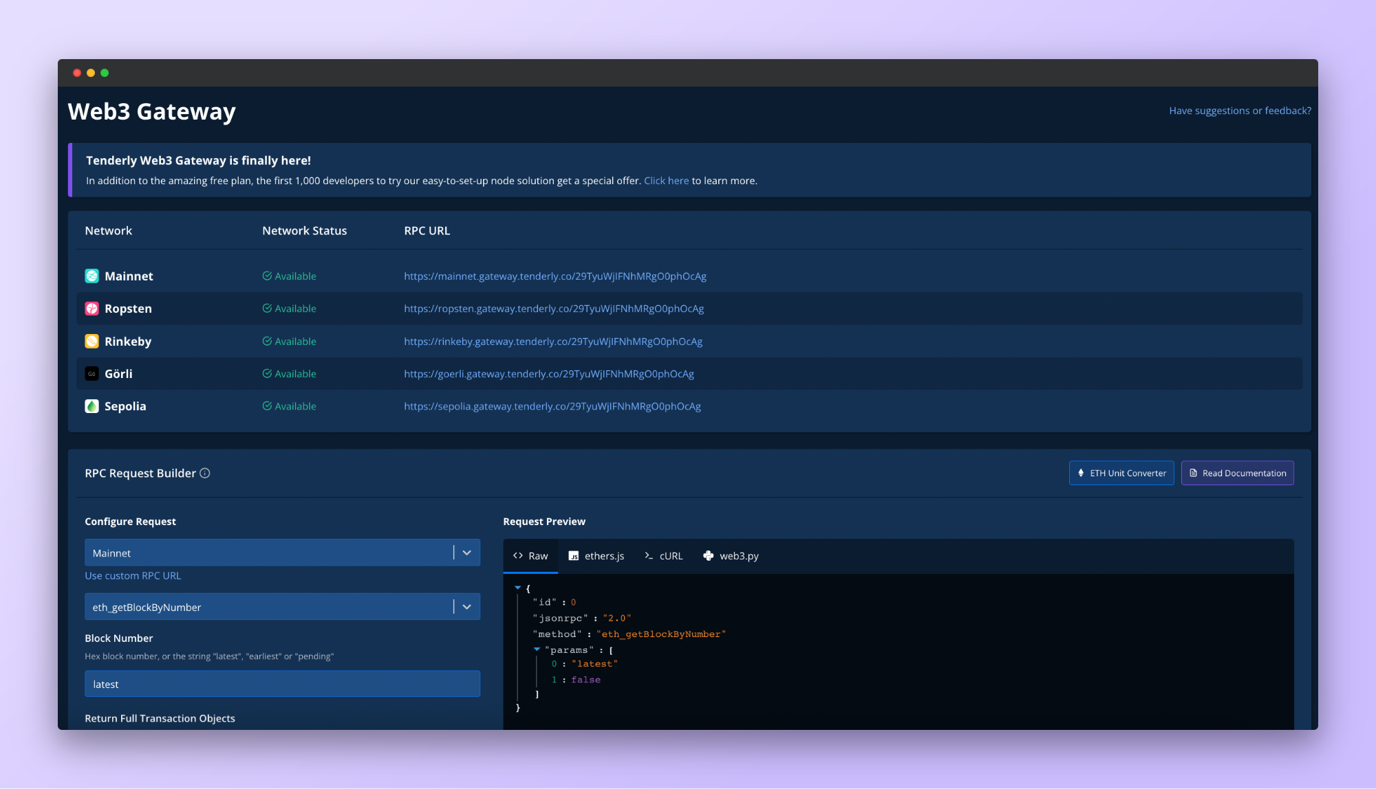 Tenderly Web3 Gateway, a production node as a service solution, enables Web3 developers to interact with the blockchain easily and scale their infrastructure faster. To query on-chain data or send transactions, all you need to do is add a single RPC URL to your dapp.