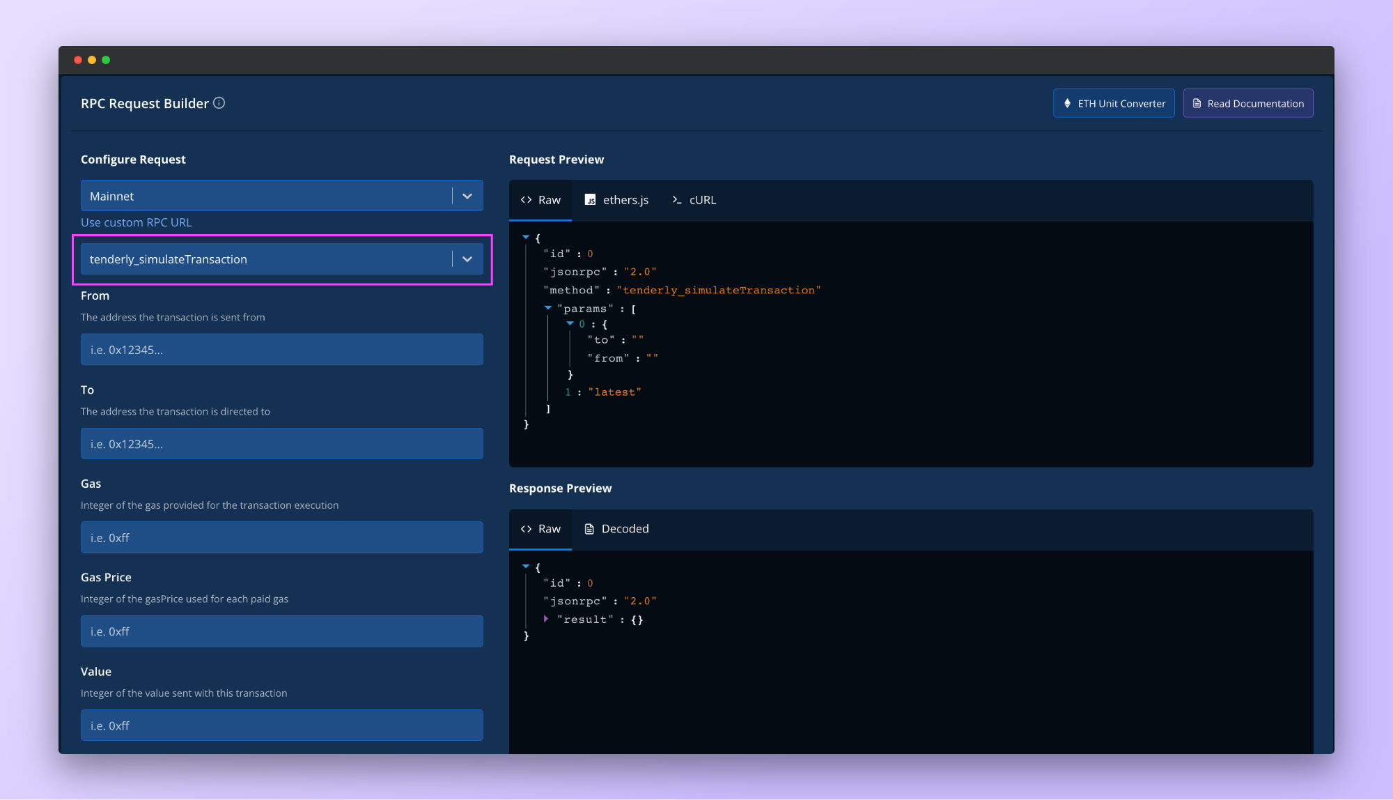Next, scroll down to the Request Builder and select the network – Mainnet or any of the available testnets. To run a simulation on the selected network, choose the first method from the dropdown tenderly_sumulateTransaction and fill out the available fields.