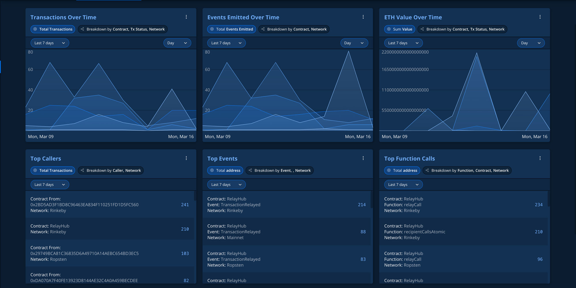 - General analytics: Use the intuitive analytics builder to visualize on-chain data such as gas usage, DAU/WAU/MAU, Value transferred over time, Events emitted, Top functions calls, Contracts that called you the most, etc.