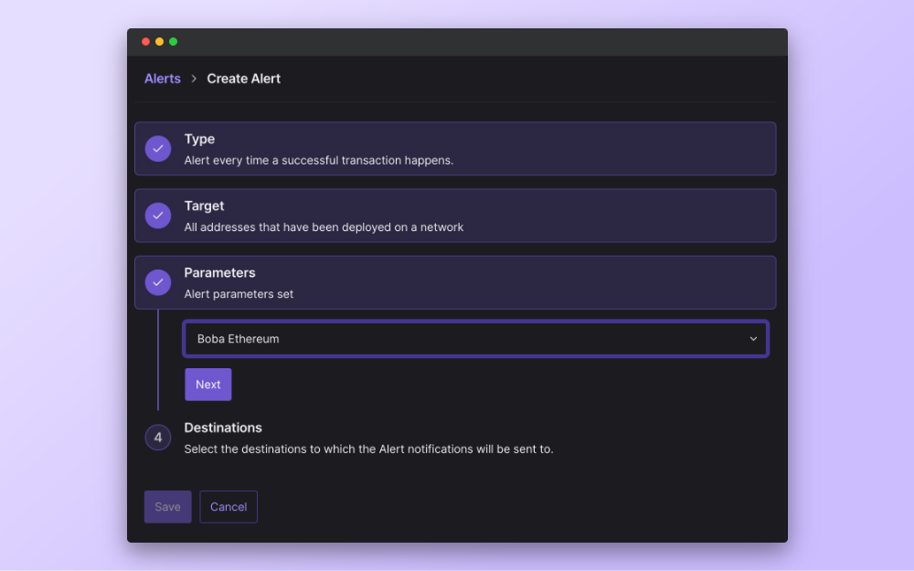 Plus, you can get updates directly to your email, Slack, or Telegram, set up webhook endpoints, or go with some other channel. This way, you can act as soon as something of interest happens on Boba Network, without having to manually check for network updates.
