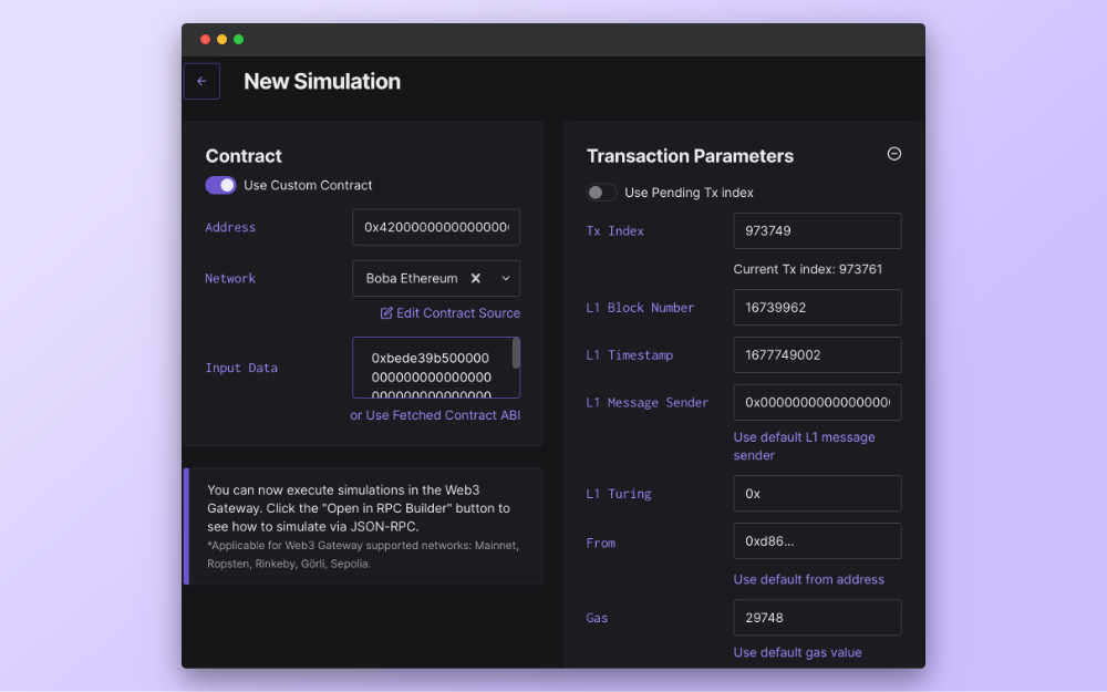 As mentioned, Boba allows you to connect Web2 and Web3 systems using their Hybrid Compute technology. Turing is a Hybrid Compute component that allows your smart contracts to interact with the outside world. To ensure these smart contracts execute properly, you can first use Tenderly simulations to test their communication with a Web2 endpoint.
