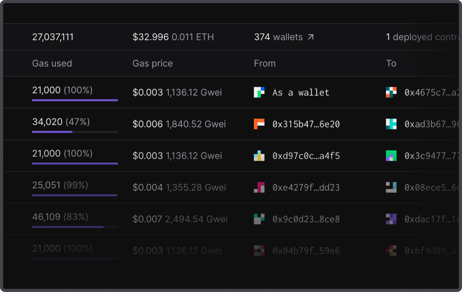 Prevent contract deployment failures by analyzing cumulative gas consumption across contract deployments. Examine aggregate gas usage of your contracts and wallets to identify unusually high consumption that would otherwise cause your contract deployments to fail.