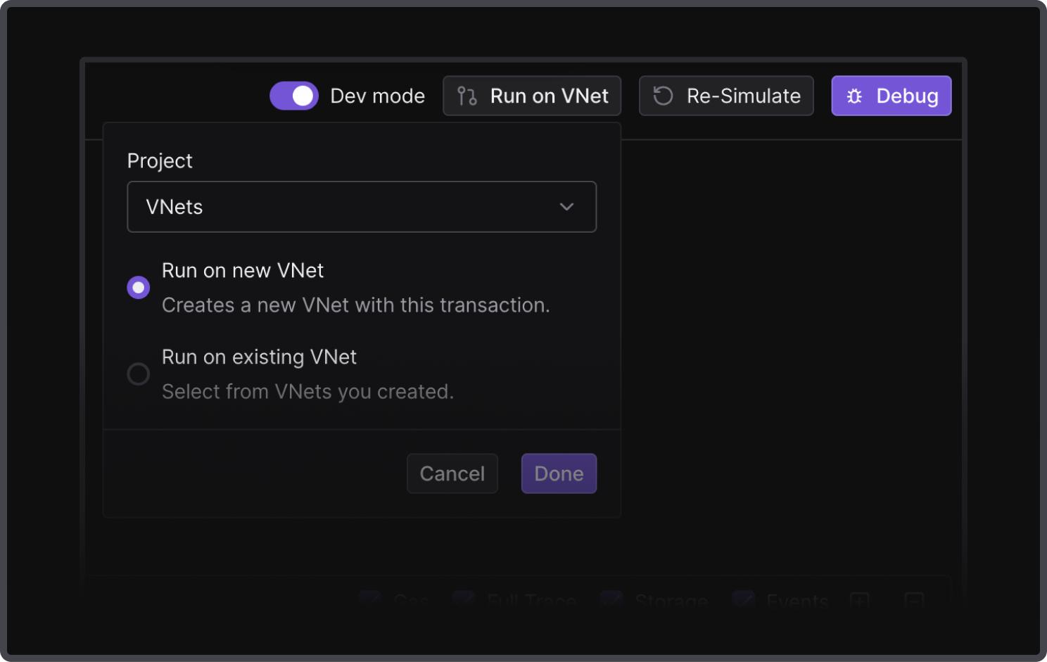Debug and iterate on top of existing transactions with the required block state replicated on Virtual TestNets. Click the Run on New VNet button on a relevant transaction to spin up a Virtual TestNet with the up-to-date state of a particular block.