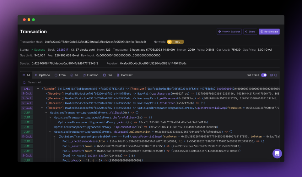 From the call trace, it was previously unclear which contract was calling a function and where the function resided. We’ve removed this ambiguity with a recent update. Now, when one contract calls another contract, this is noted as: