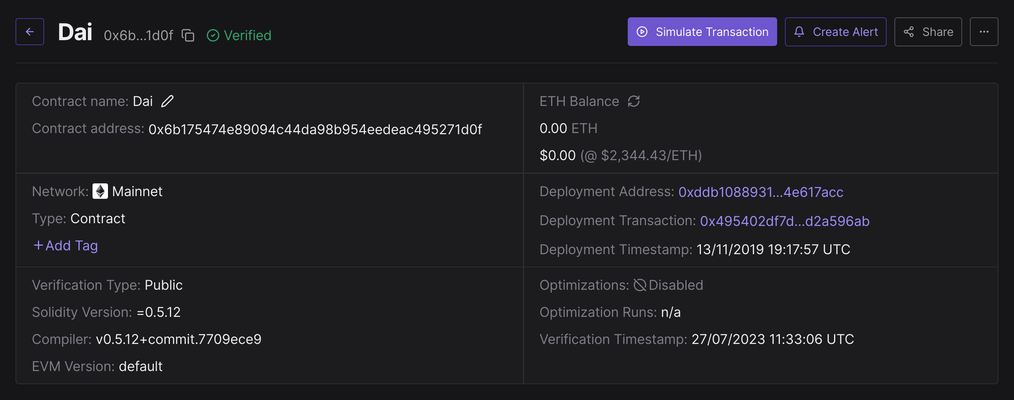 Now, we've supercharged the Contracts page! 🚀 You get a detailed overview of each contract, including essential data such as the compiler settings, ETH balance, verification status, deployment address, and more.