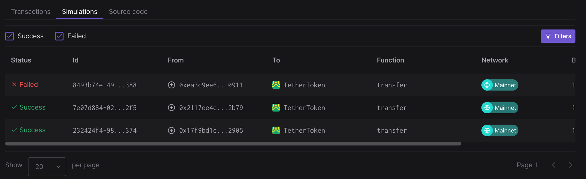 - Simulated transaction listing: When you simulate a transaction coming from a specific contract, we sort the simulations in a list that you can filter and sort.