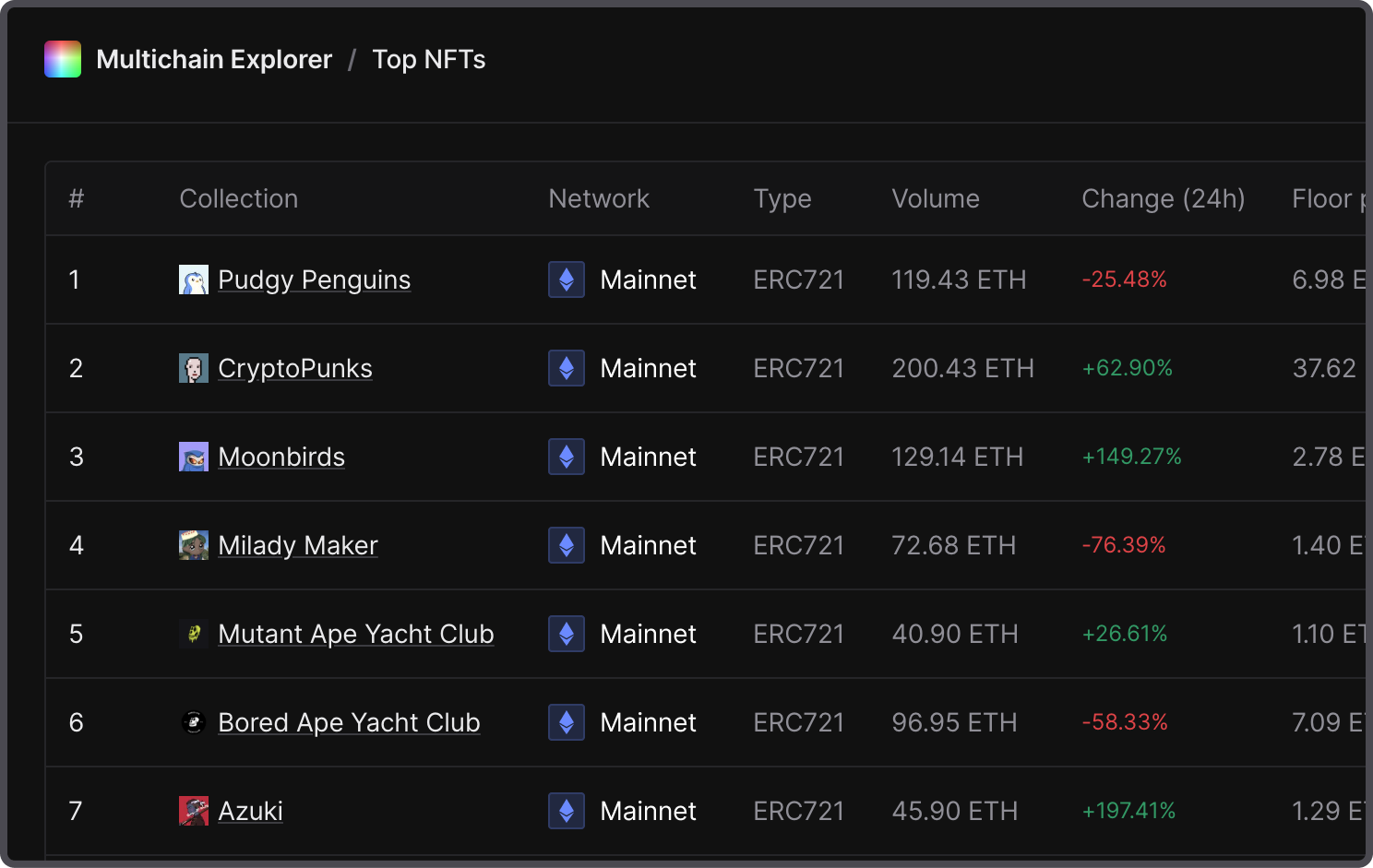 Get essential information on top NFTs across chains, including how many transfers took place in the previous month, who the holders were, and the latest movements on the market.