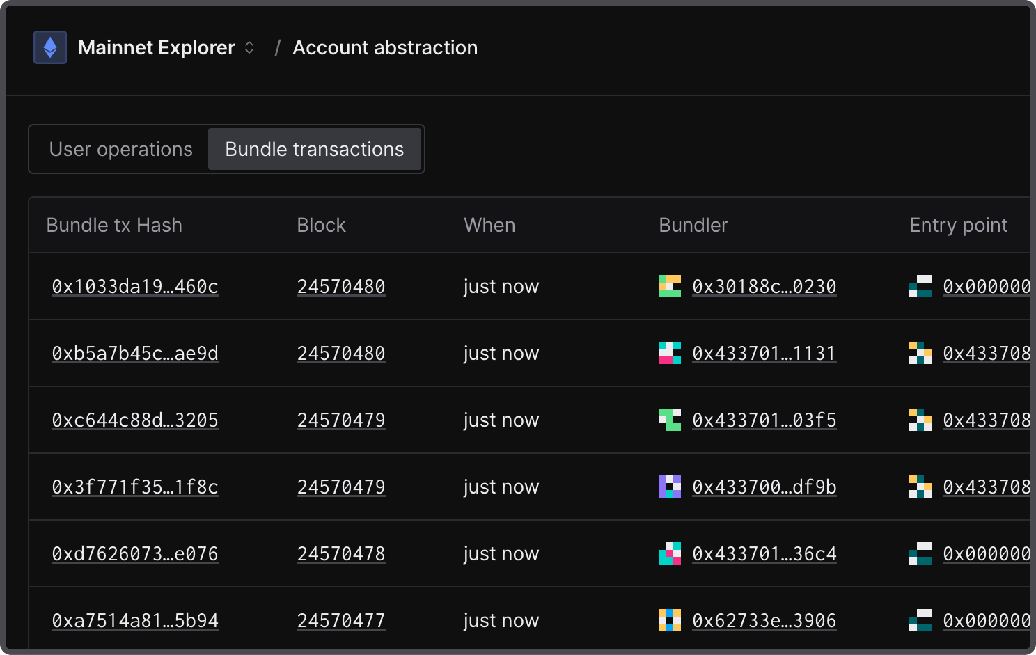 Inspect account abstraction implementations across chains from a single explorer. Dive into user operation execution, analyze bundler actions and behaviors, and track authorization changes with ease. Explore account abstraction with ease!