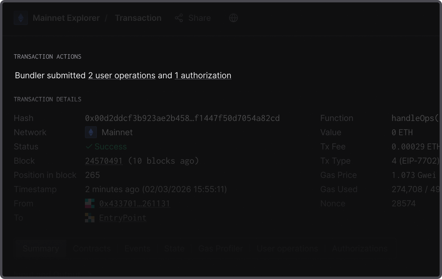 Analyze account abstraction implementations with full support for ERC-4337 and EIP-7702 in Tenderly Explorer. Dive into user operations, bundlers, and smart account authorizations with granular visibility for easier and faster exploration.