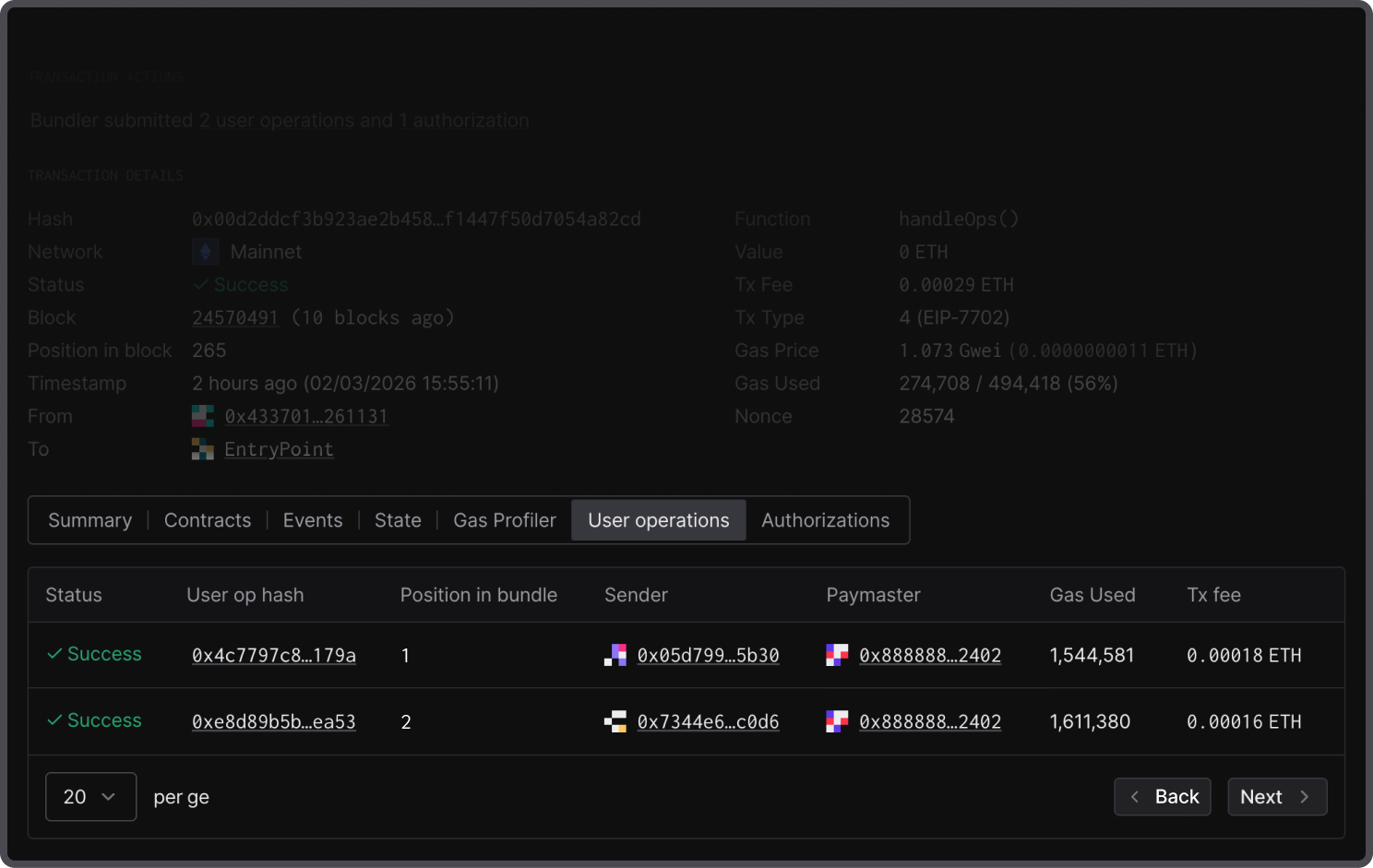 Move to a single user operation for a granular overview of its execution details. Inspect all relevant parameters in the transaction receipt, including user operation and bundle transaction hashes, user operation fee, and bundler and paymaster addresses.