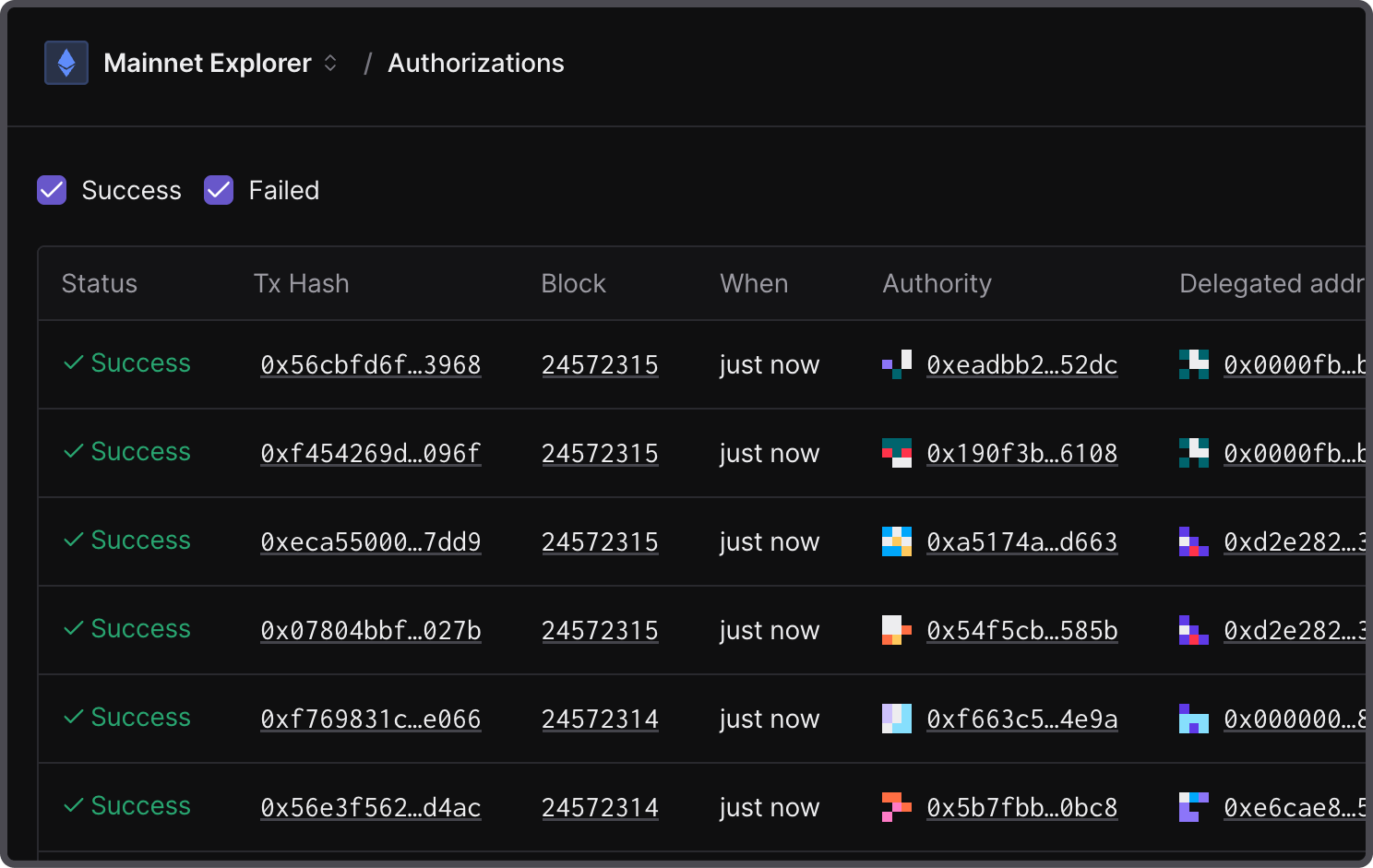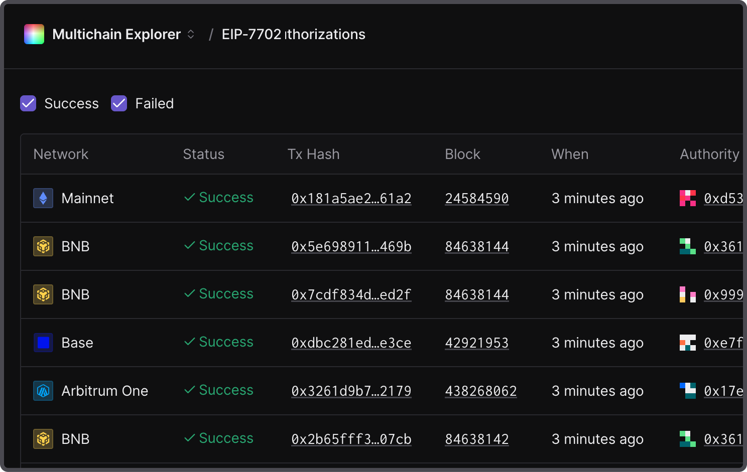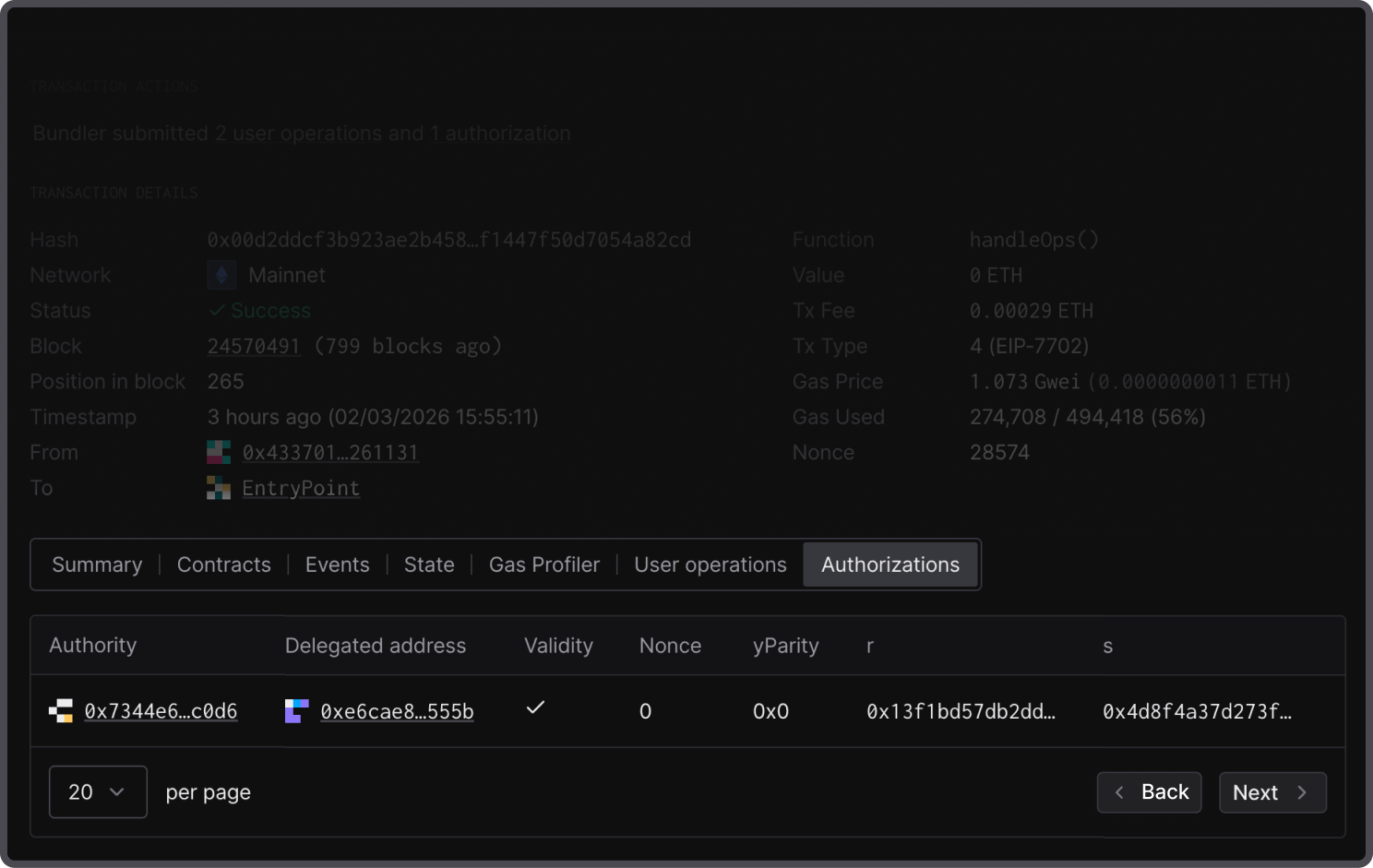 Explore authorizations per address by opening an individual transaction and navigating to the Authorizations tab for a list of authorizations to track their updates over time.