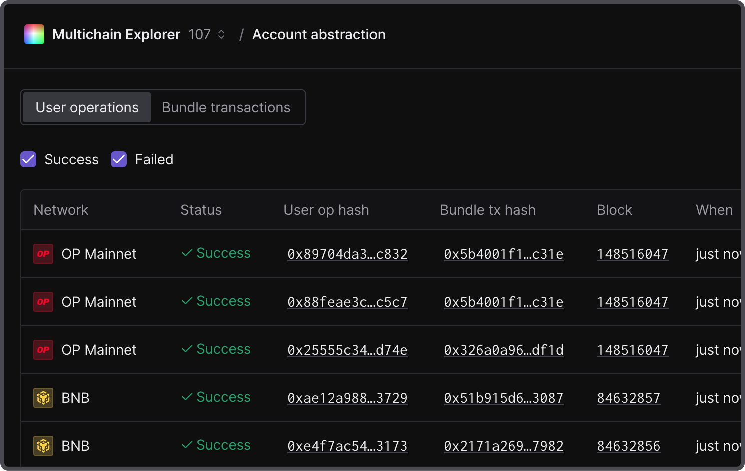 Open a list of the latest user operations for a quick overview of relevant hashes, execution times, and related fees in a multichain view.