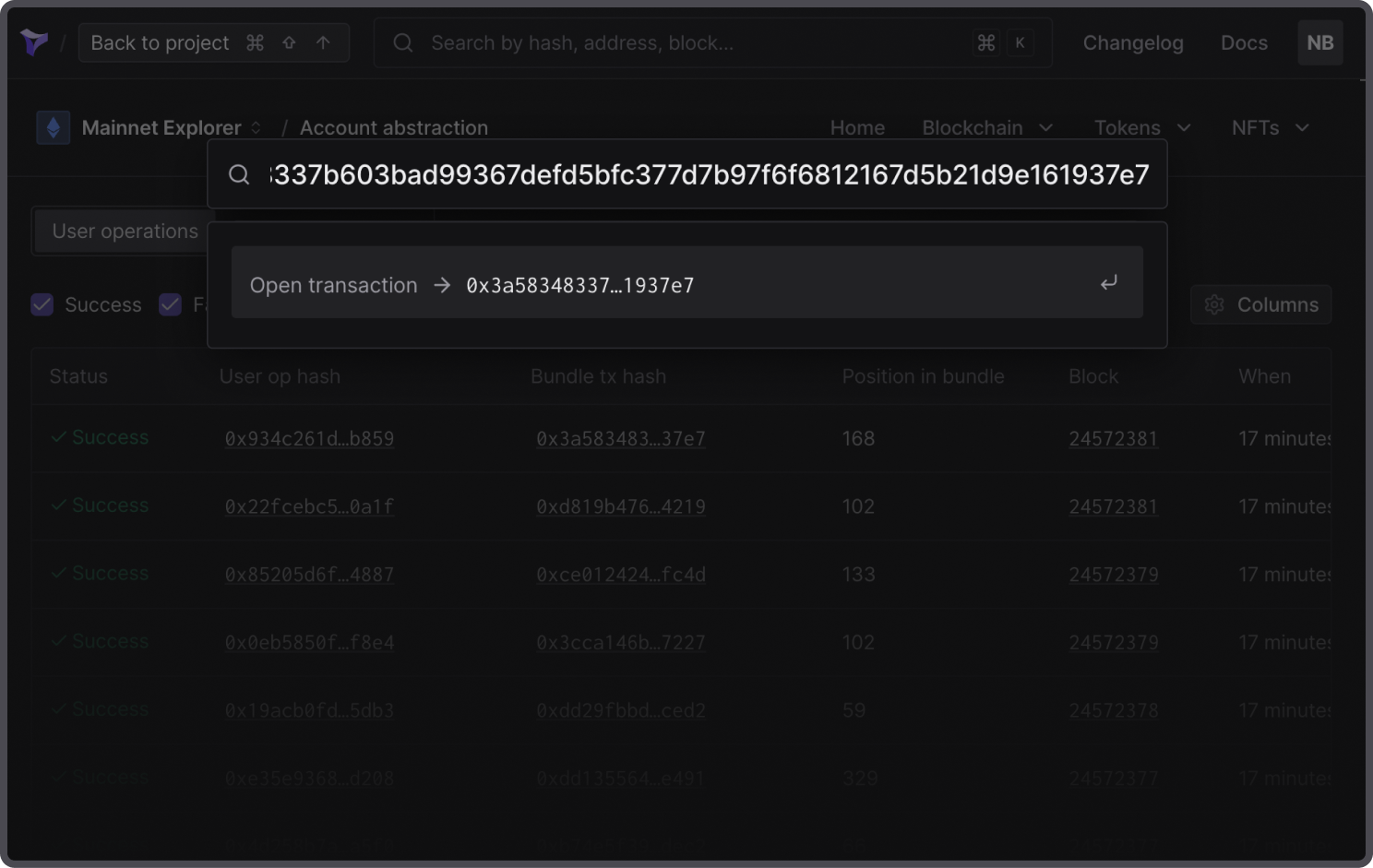 Find specific user operations, bundle transactions, paymasters, or authorizations instantly. Type any relevant hash or address in the search bar to jump directly to the detailed view.
