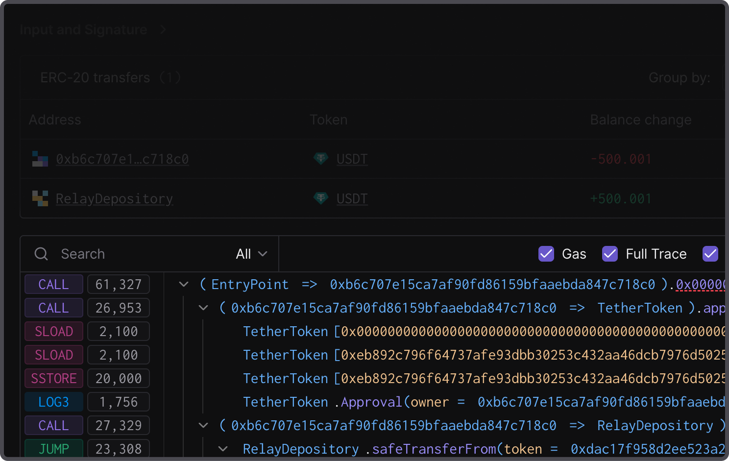 Understand how a user operation consumes gas by hovering over Gas Used for a detailed breakdown of the gas usage for each operation.