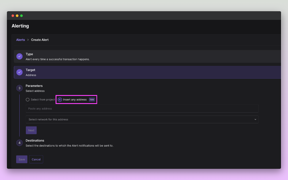 For those who rely on Tenderly Alerts for contract monitoring, the option to insert any contract address is located under the Parameters section.