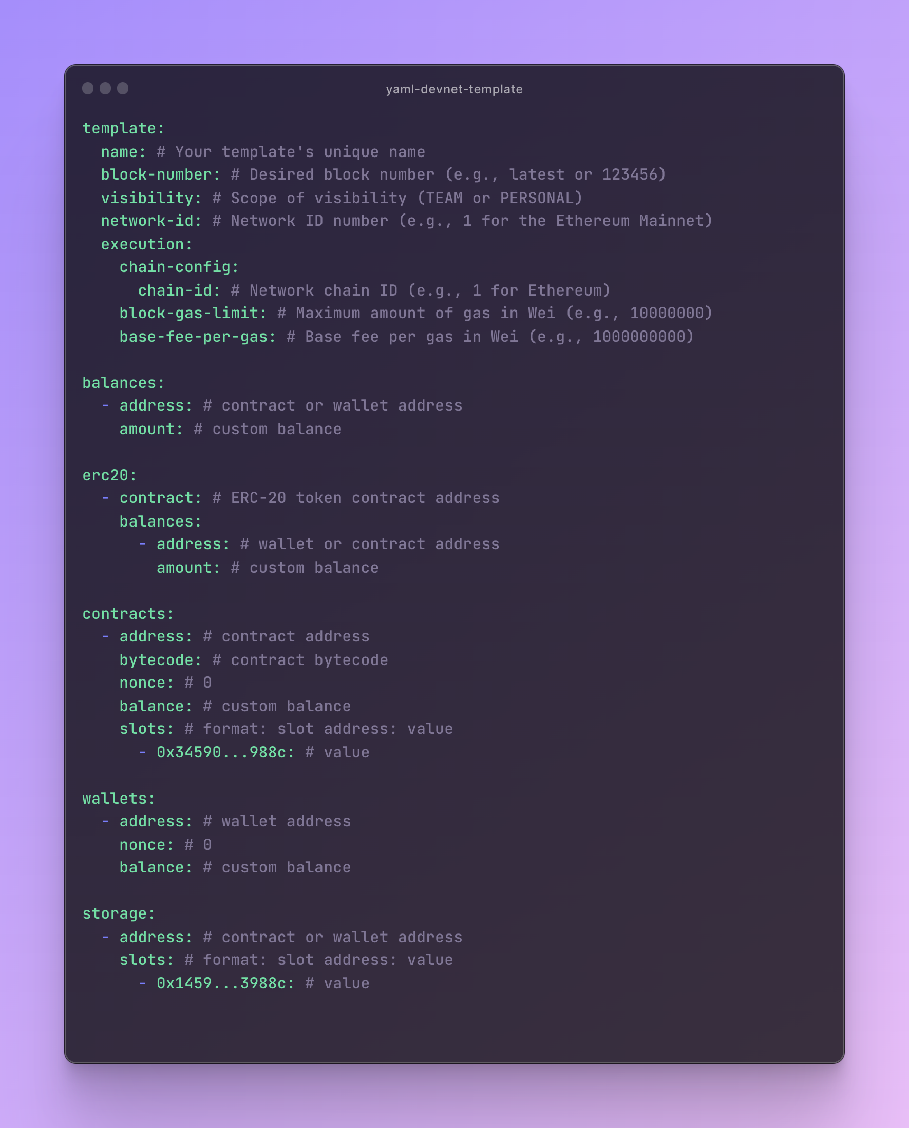 YAML templates consist of one mandatory field (template) and several optional fields (wallets, contracts, storage, balances, erc20). These fields are designed for advanced control and customization of your DevNet environment.