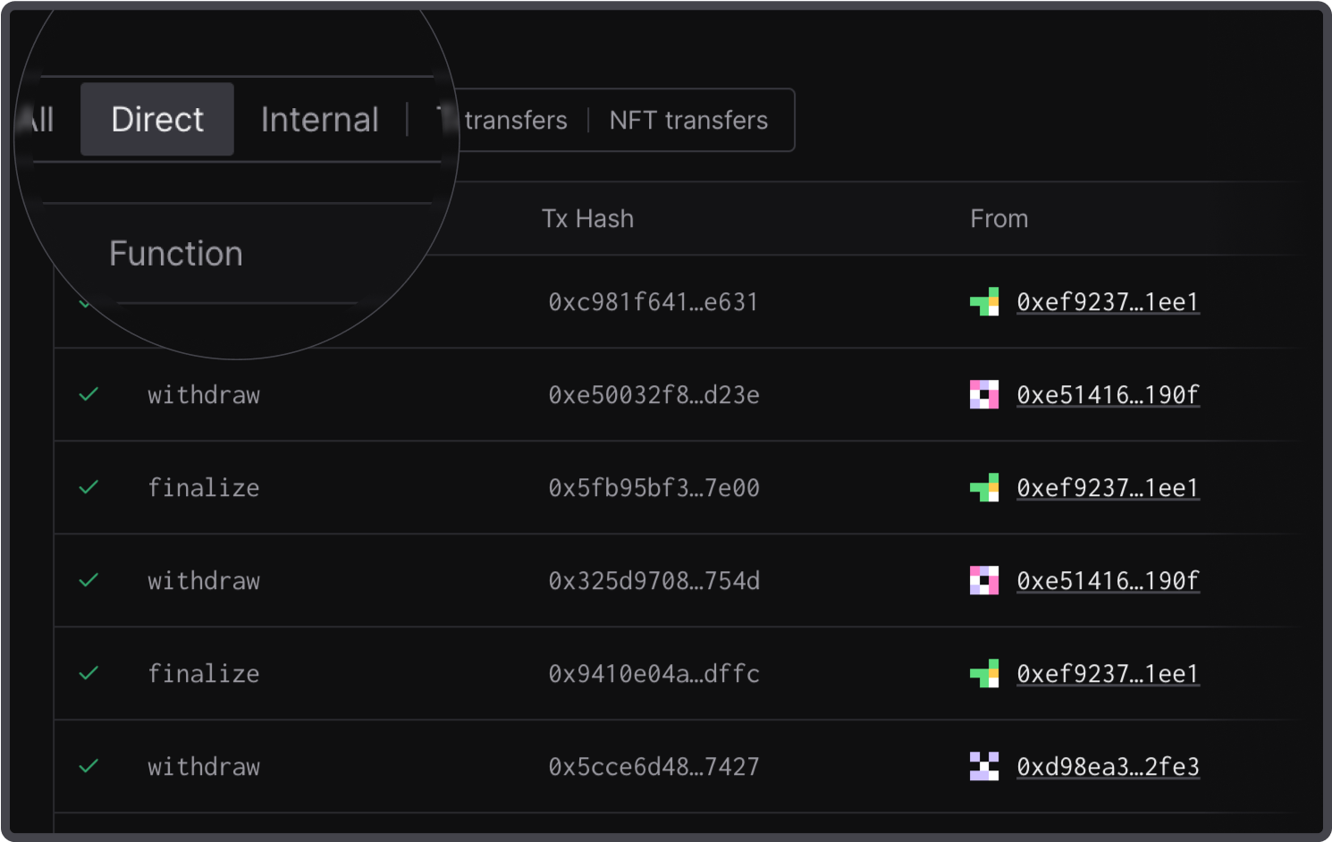 Sort through direct and internal transactions to better understand wallet or contract activity.