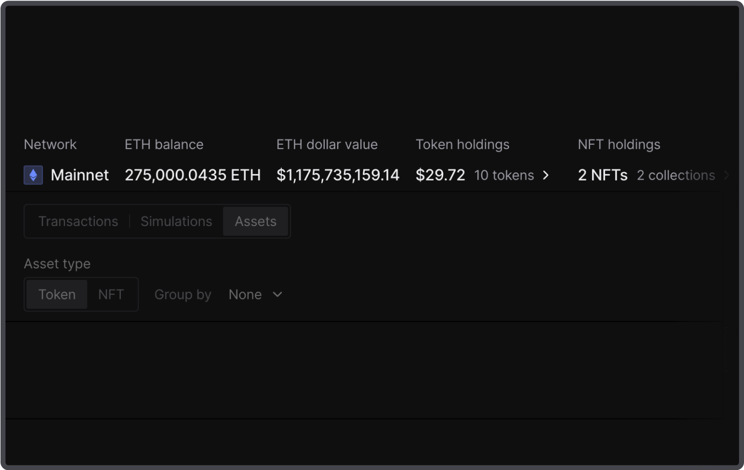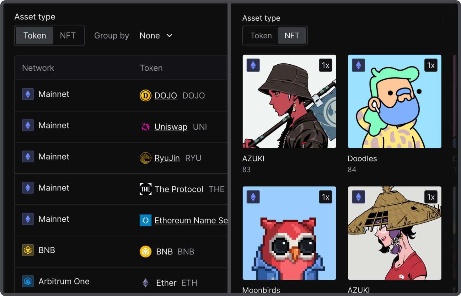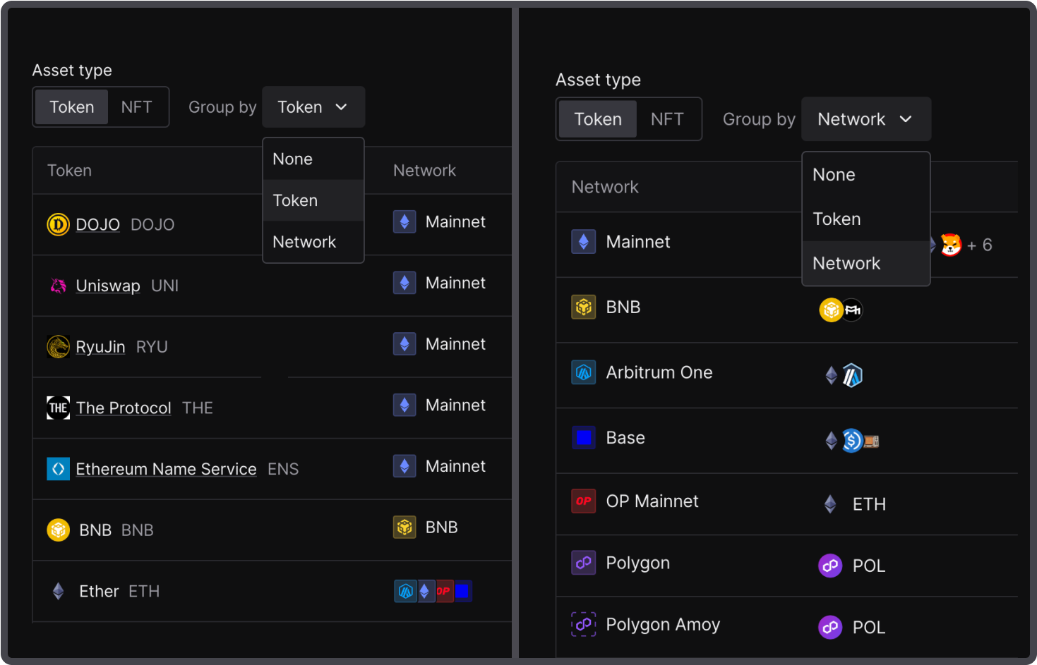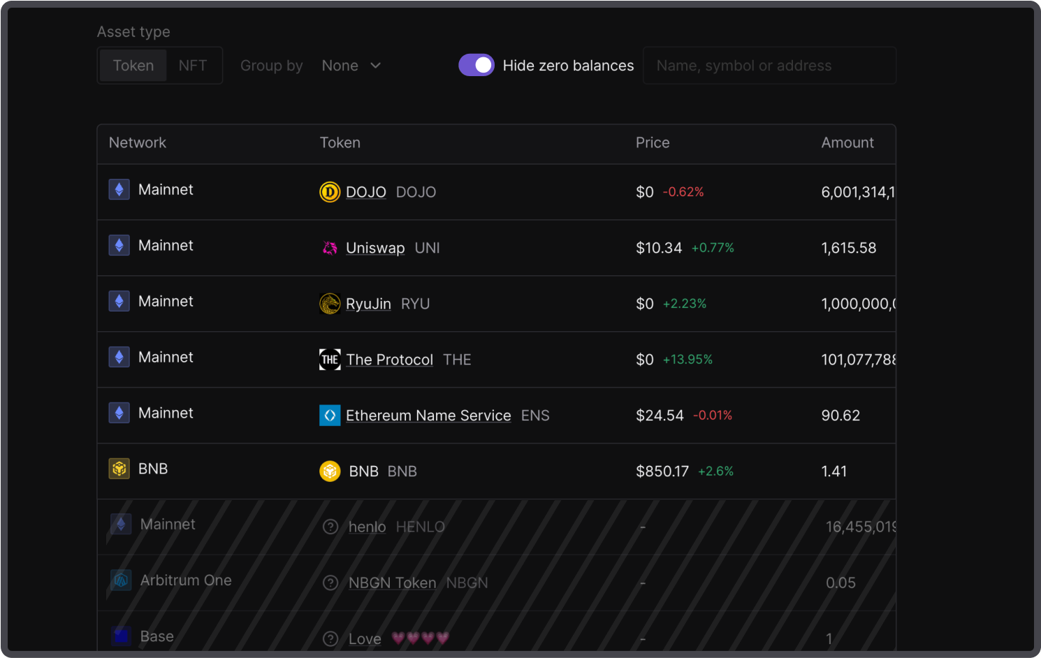 Group the assets by token or network for a better overview across 100+ chains. Inspect the current price along with the 24-hour changes, amount, and the percentage of the portfolio’s holdings.