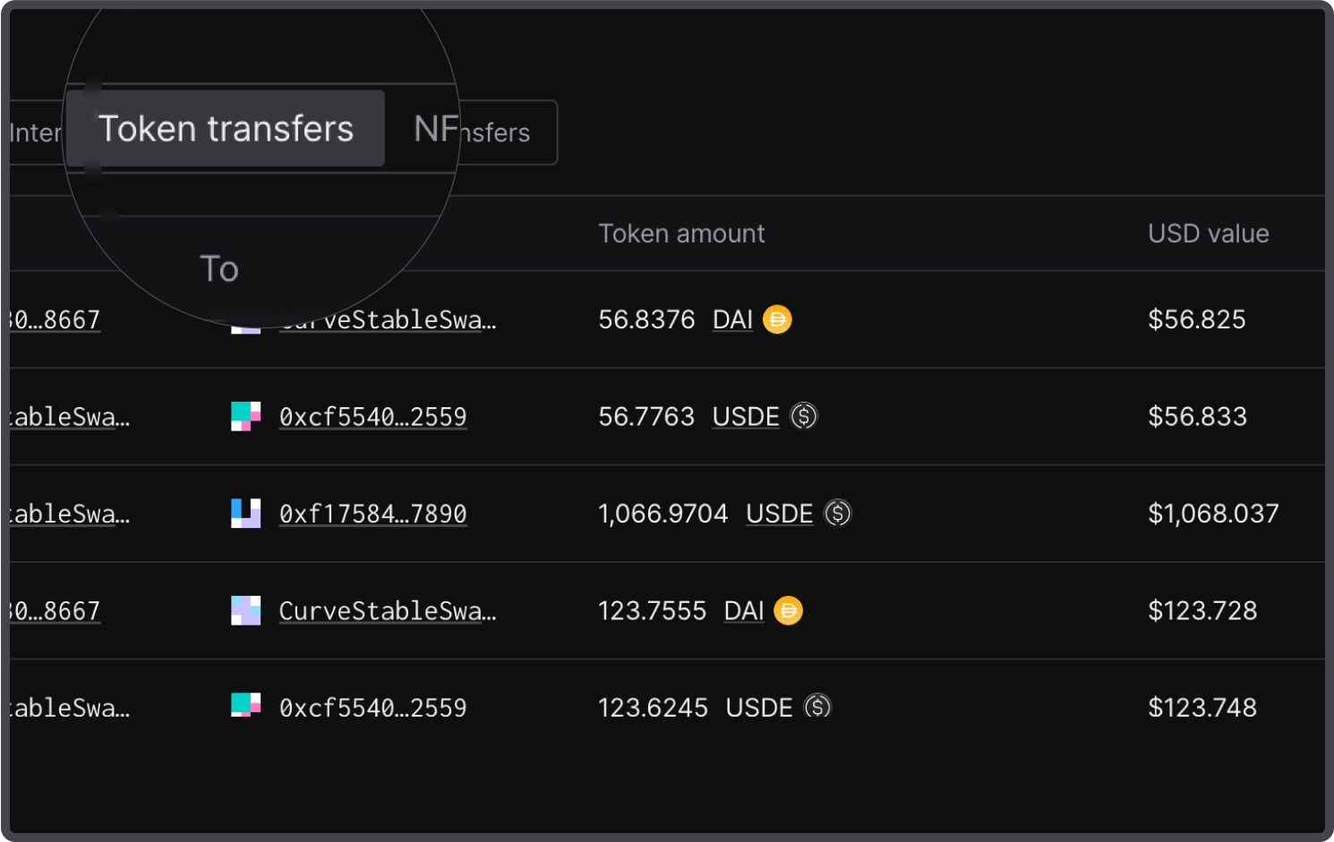 Analyze token and NFT transfers directly from the address page, including the corresponding dollar values for the transferred tokens.