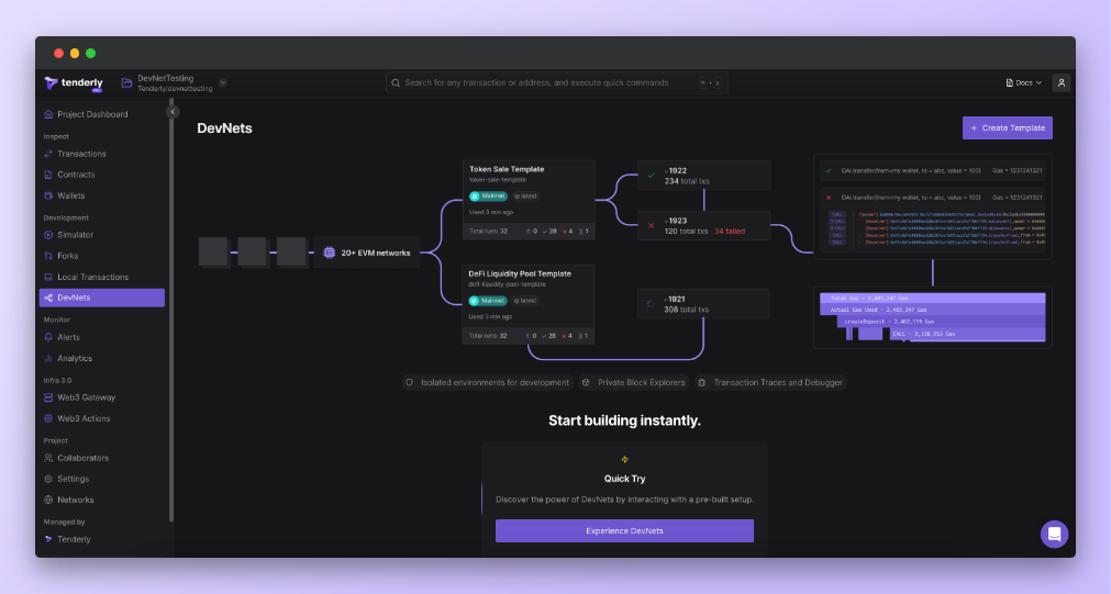 - Tenderly's leading suite of development and debugging tools built into the environment, such as Debugger, Gas Profiler, Trace Transaction, and Simulator.