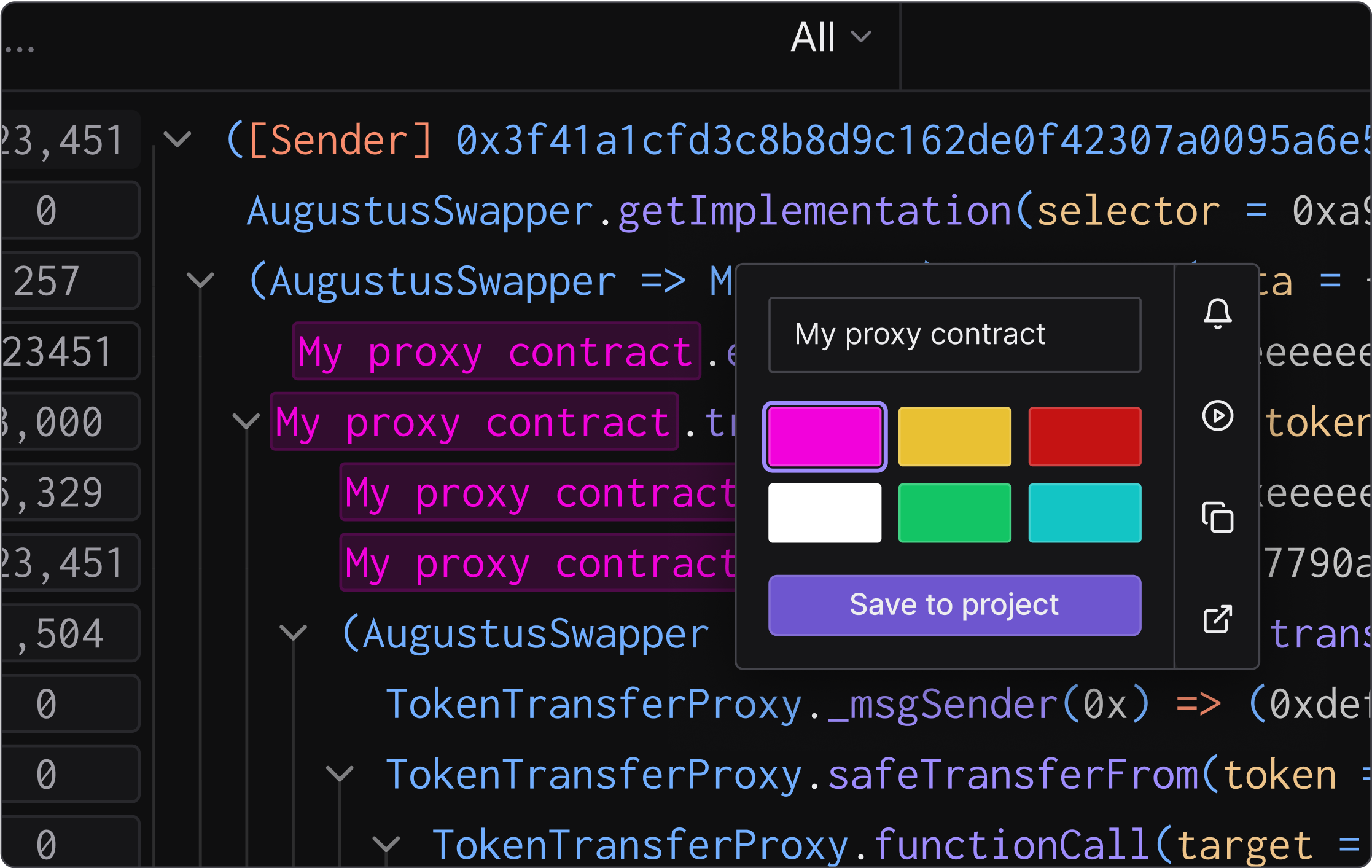 You can now highlight important addresses across your project through color-coding and custom naming. Set specific names and colors for team contracts for greater visibility across the Tenderly Dashboard.