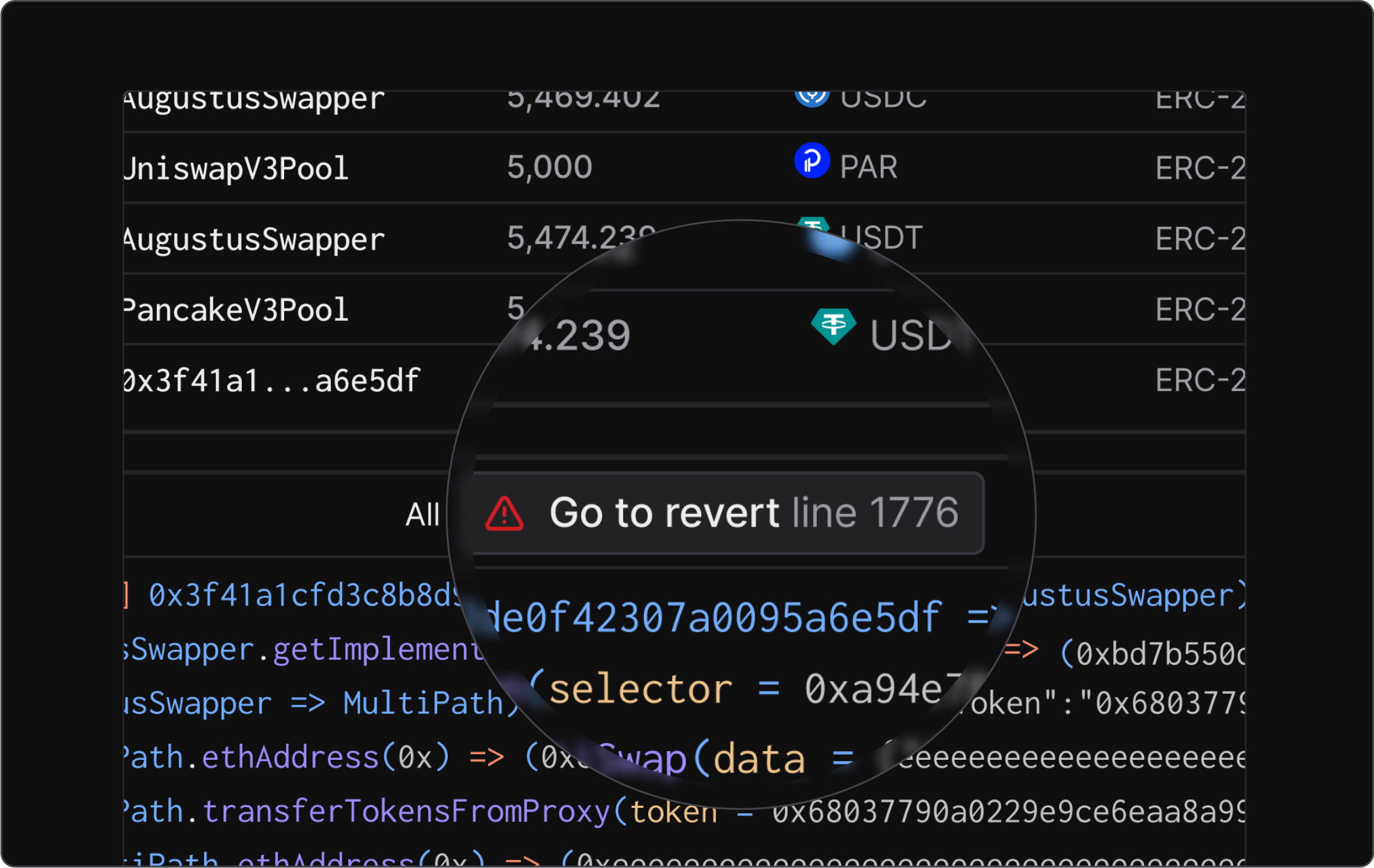 Reverts are now clearly displayed in the transaction execution header. Click and open a revert directly, jumping to the line of code where the error occurred.