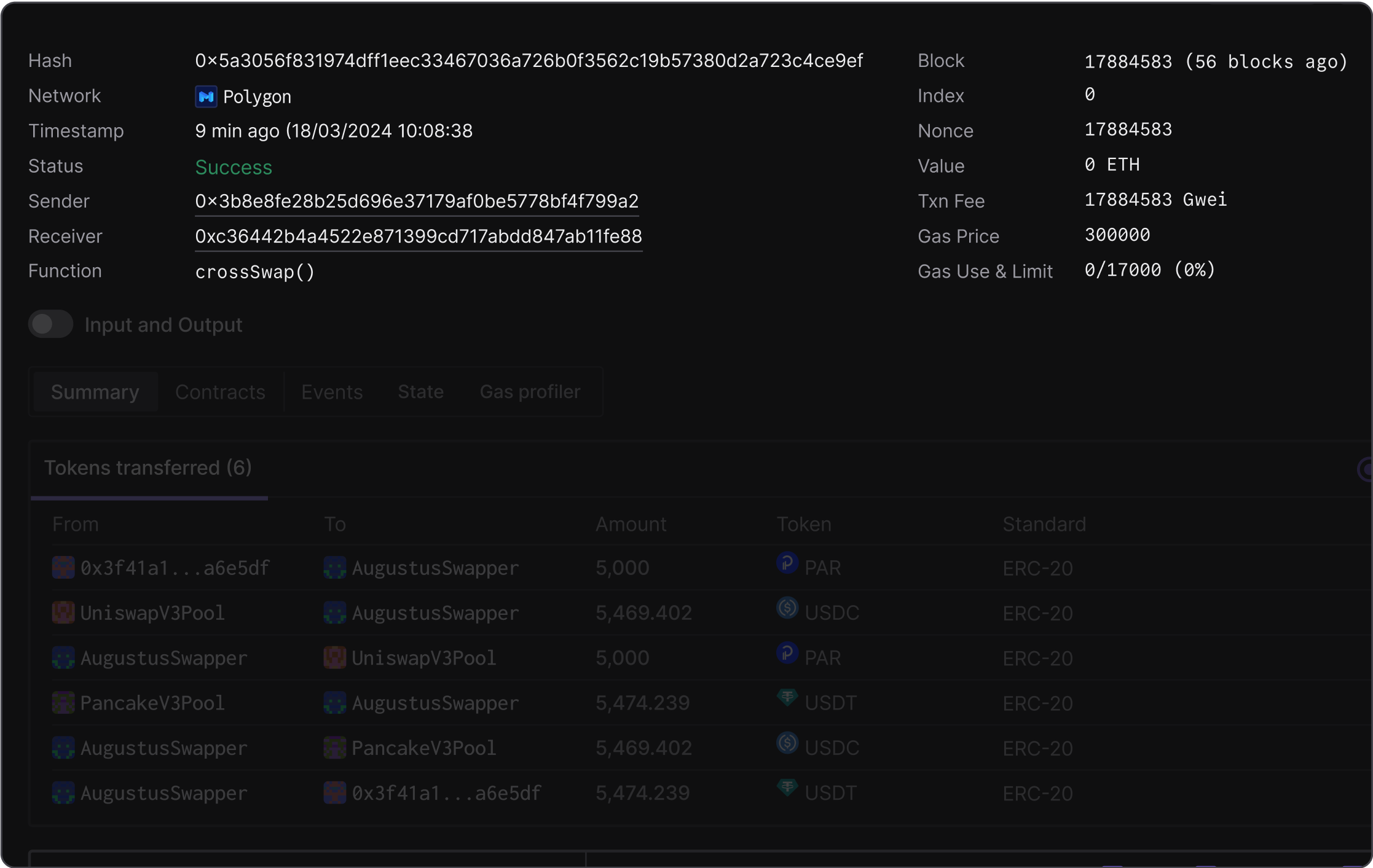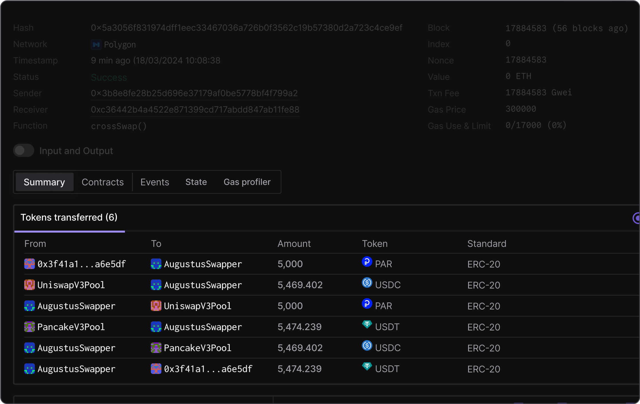 You can also find all details on transaction execution in a single place. Еasily navigate between and inspect transferred tokens, emitted events, state changes, and other details.