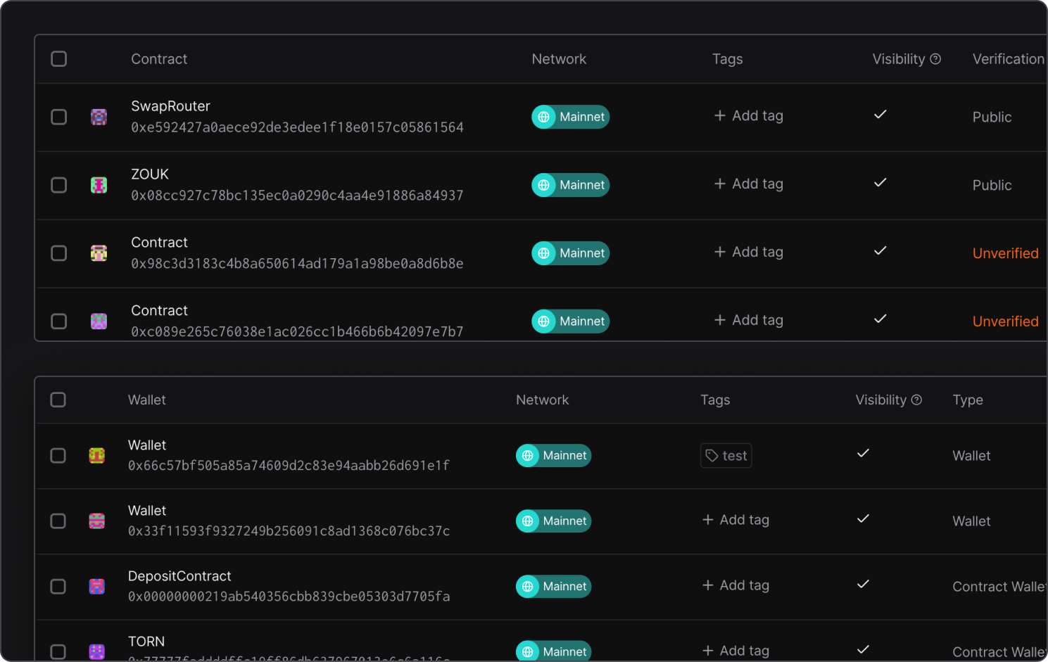 The list of contracts and wallets has been updated for improved readability. Find relevant addresses more easily thanks to a clear, simplified overview.