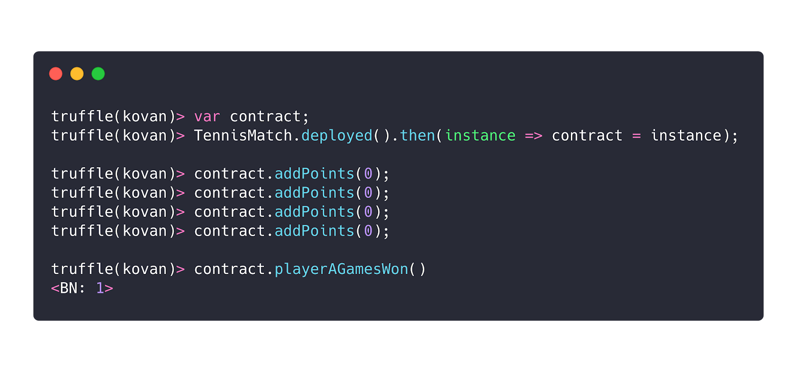 We call the addPoints function to add points for a player. This means that we expect player A to win the first game if we call the addPoints(0) 4 times. Let’s try it out: