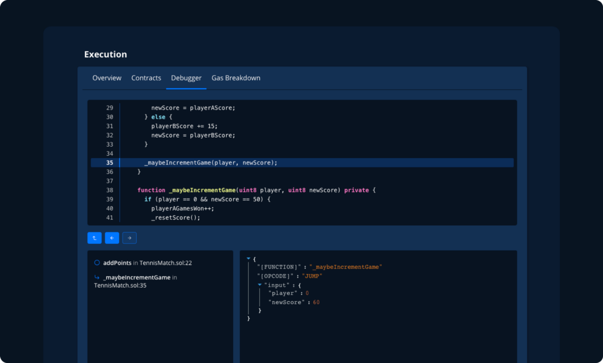 Now we have a way to reason about our transactions better than ever: the Execution Overview gives us a birds-eye view of our transaction so we can dive in quickly into the important bits, the Stack Trace shows us the exact code path that led to an error, and now the Debugger helps us see, step by step, the exact way our code behaves. All this completes the tooling needed to introspect and debug any transaction, no matter how complex or simple.