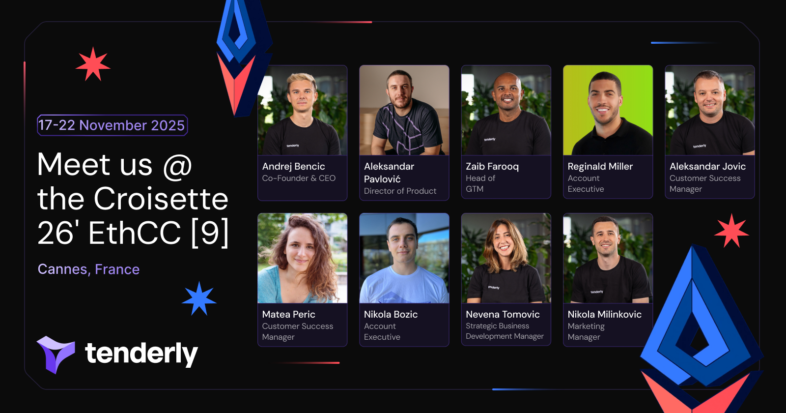 When EthCC announced it was locking in Cannes for the 2nd consecutive year, the community was thrilled as Riviera felt like the place to be for EthCC. After an unforgettable EthCC[8] last summer, we're heading back to the Côte d'Azur for EthCC[9] in spring, like in those first years. This time, we're bringing a bigger crew and an even more ambitious lineup. From March 30th to April 2nd, the Palais des Festivals will once again become the centre of Ethereum gravity, and Tenderly will be there.