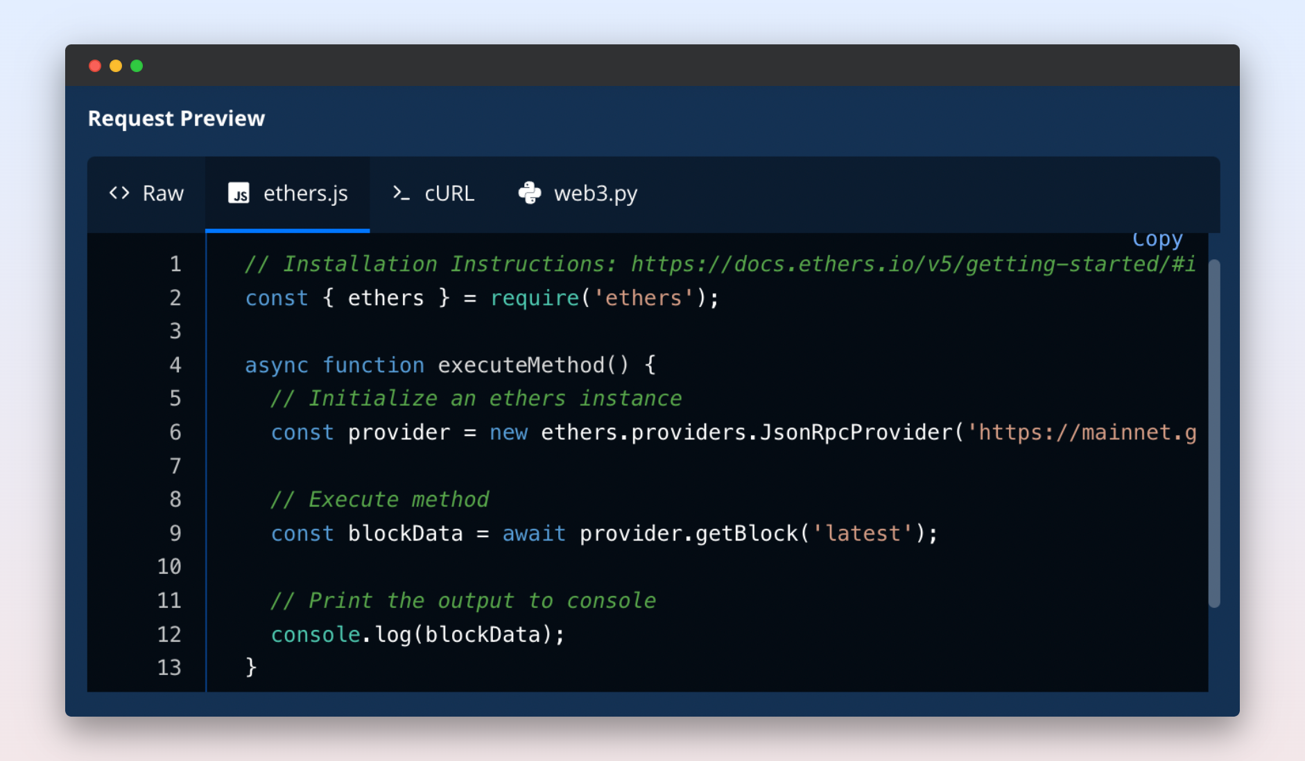 Depending on the language and architecture of your dapp, we give you the option to choose between using the raw request data, Ethers.js, cURL, and Web3.py snippet versions of the request.