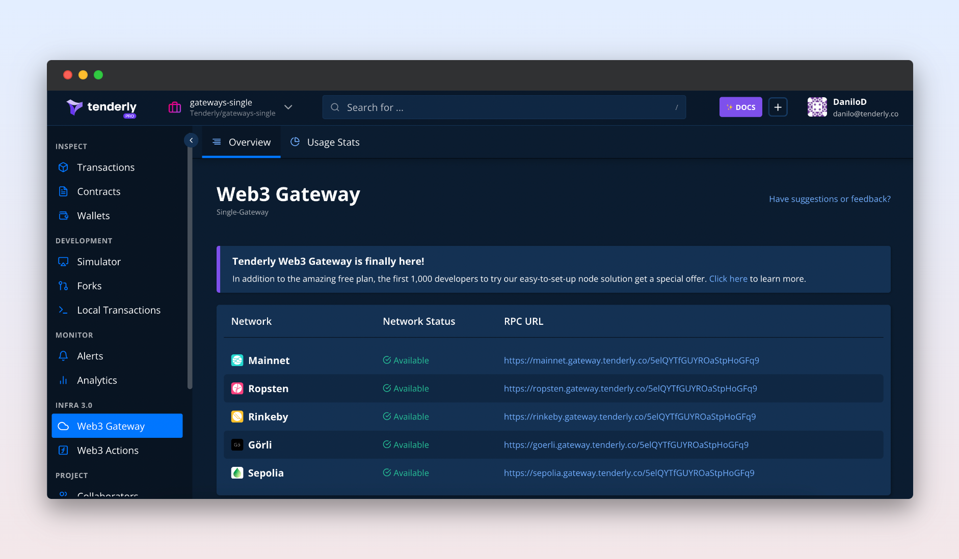 When you create a Tenderly account, we’ll automatically set up the RPC URLs for each supported network, as well as the access keys. This means you can integrate Tenderly Node into your code right out of the gate without any additional setup steps.