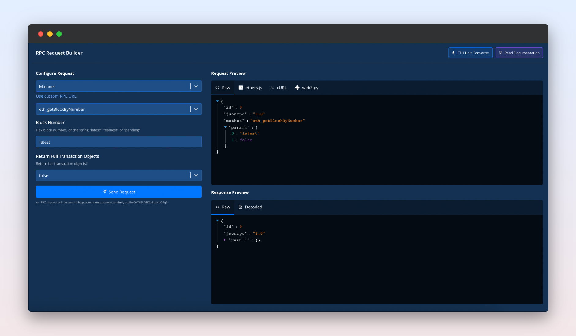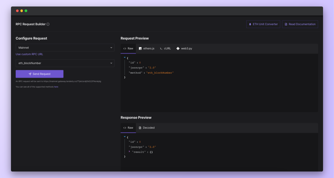 The RPC Request Builder is where the magic happens. This section has three panels with options to define your request, test it out and analyze the data, and auto-generate code snippets that you can insert into your dapp.