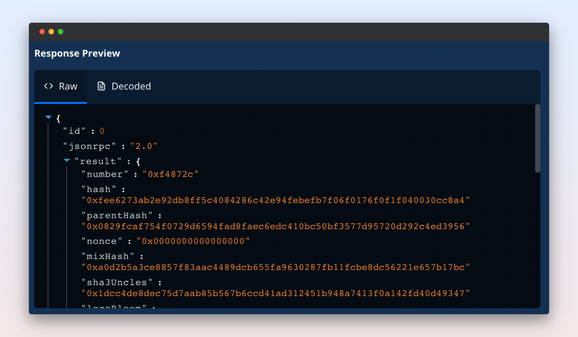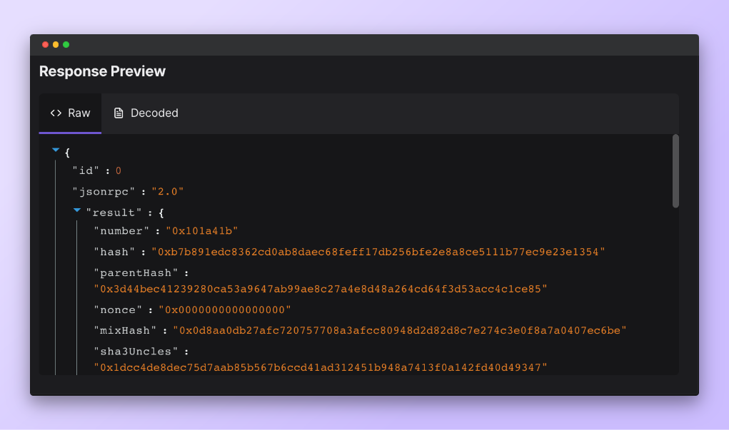 The response will be displayed in the Response Preview panel in its raw and decoded form. Even though this is a preview, the data that you get back is queried from the blockchain and is accurate.