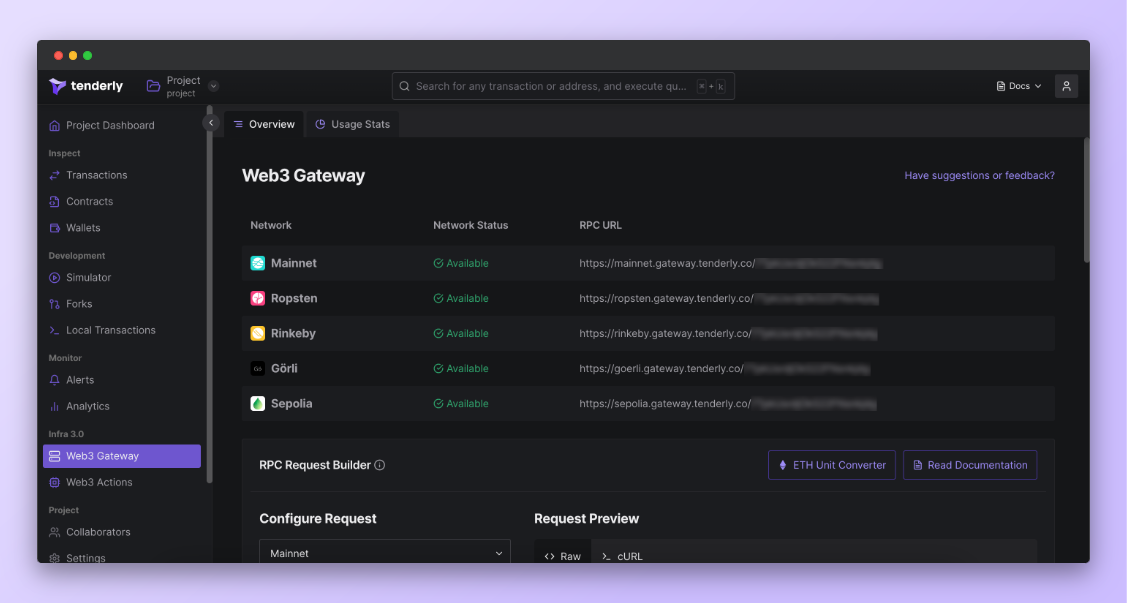 Request Preview: Once you’ve defined the parameters for your request, Tenderly will automatically generate the code snippet for that request. You can copy and paste this code into your project and start making calls to the RPC URL.