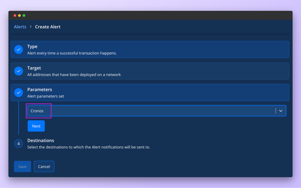 With Tenderly’s observability stack, you can monitor your smart contract usage on Cronos. Stay up to date by receiving customized notifications directly to Slack, Telegram, or some other channel with Alerting. Set up relevant triggers for your alerts and keep track of important changes on Cronos.