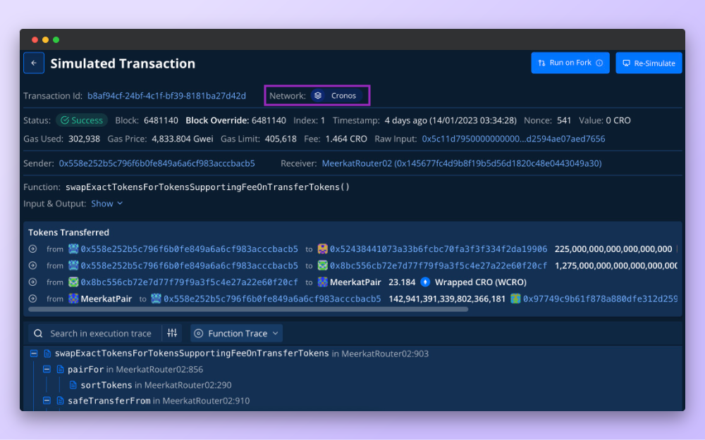 Just like Cronos, Tenderly enables developers to build dapps that offer a frictionless user experience. For instance, you can integrate with Simulation API to eliminate guesswork and allow your users to preview transactions directly from your Cronos dapp. This way, they can be confident their transactions will execute as expected.