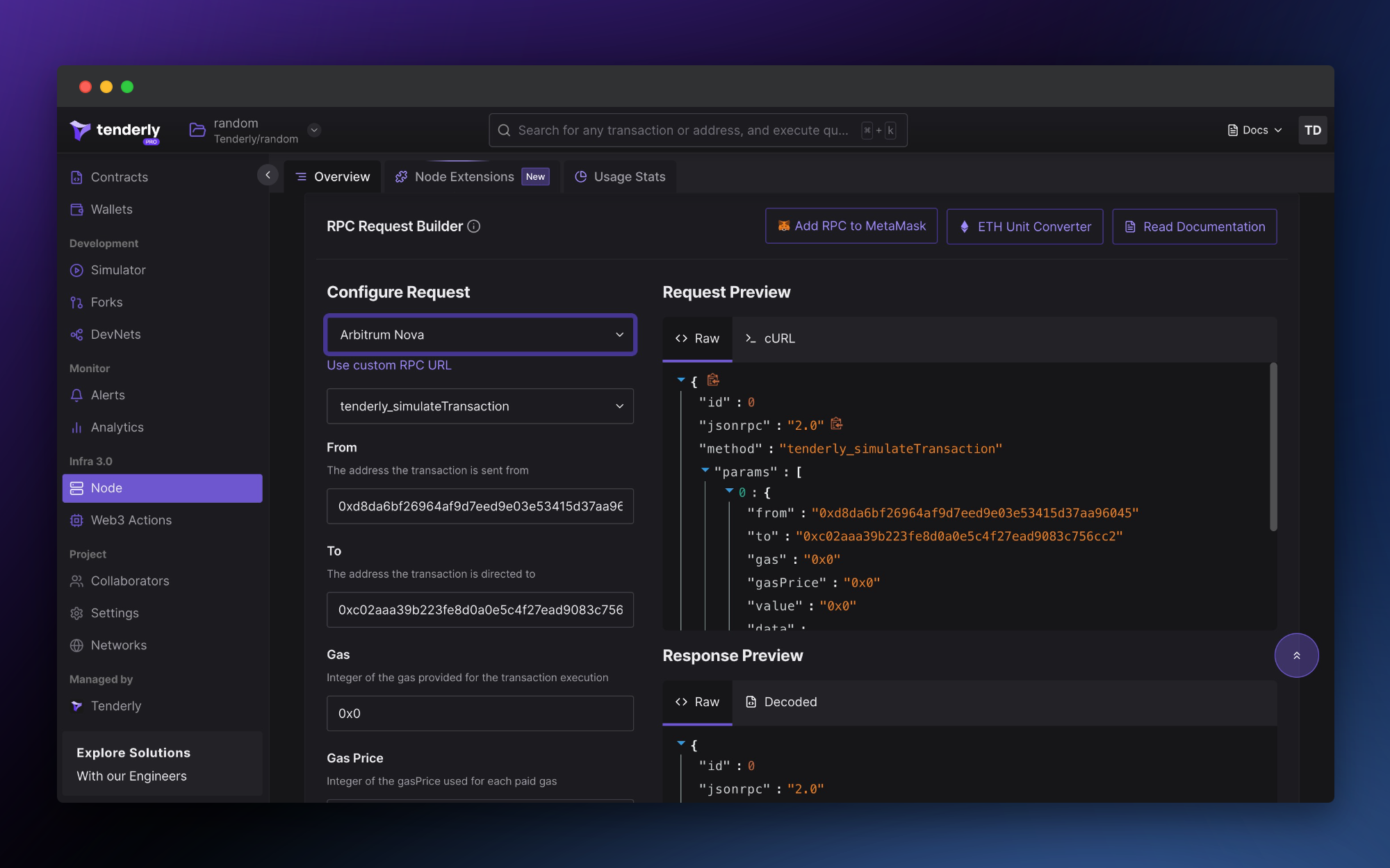 With the Tenderly Simulation Infrastructure, you can allow users to preview transactions before sending them to Arbitrum Nova. This way, you help them prevent unexpected failures, unnecessary costs, and hidden security risks. You also simplify and secure the user experience, build trust and loyalty with your users, and ensure full transparency.