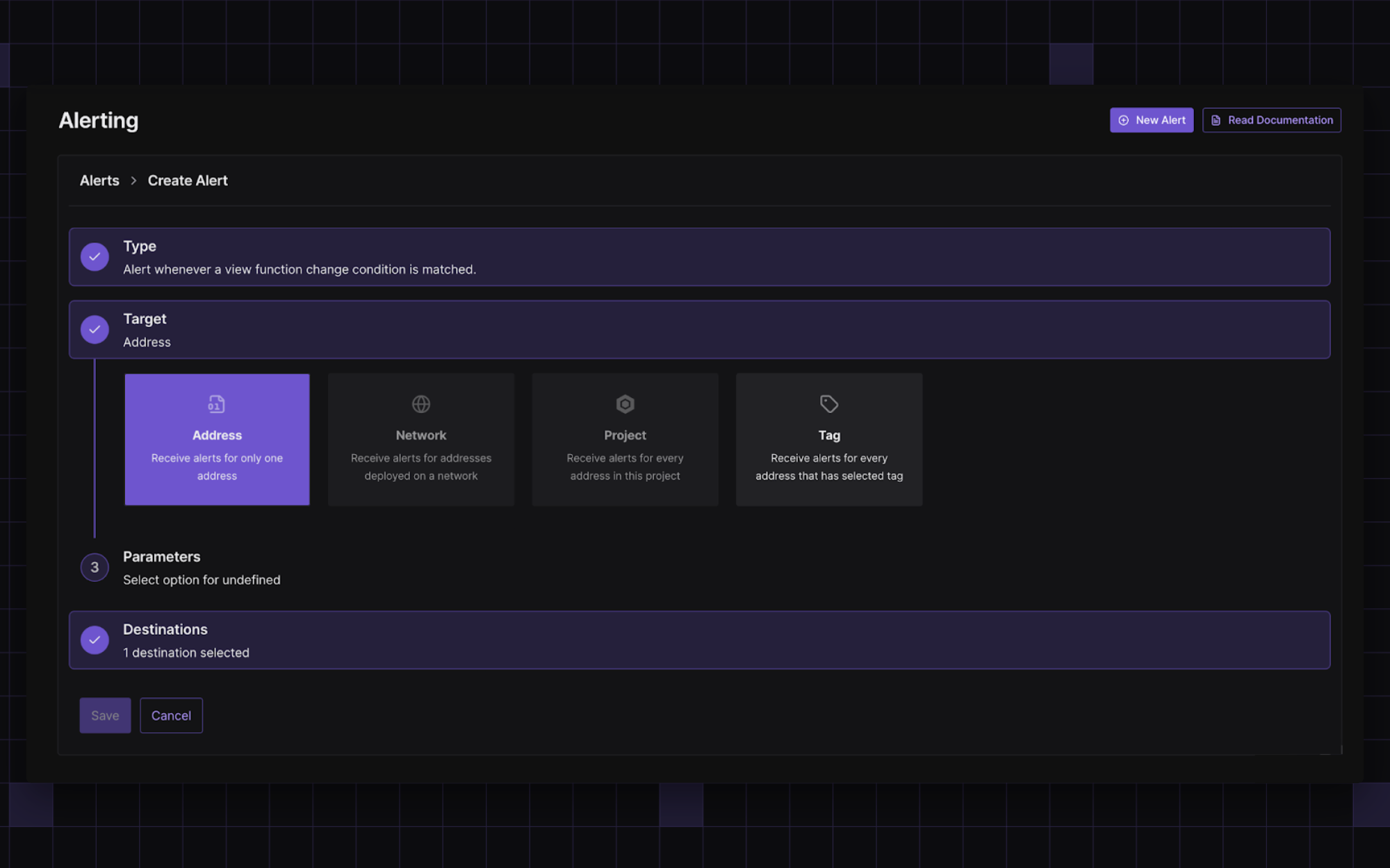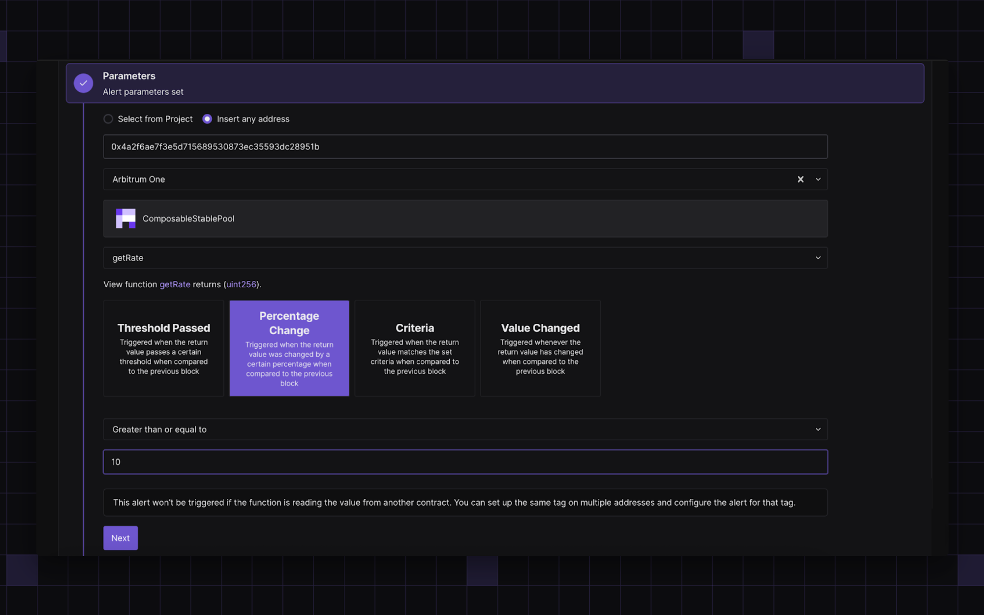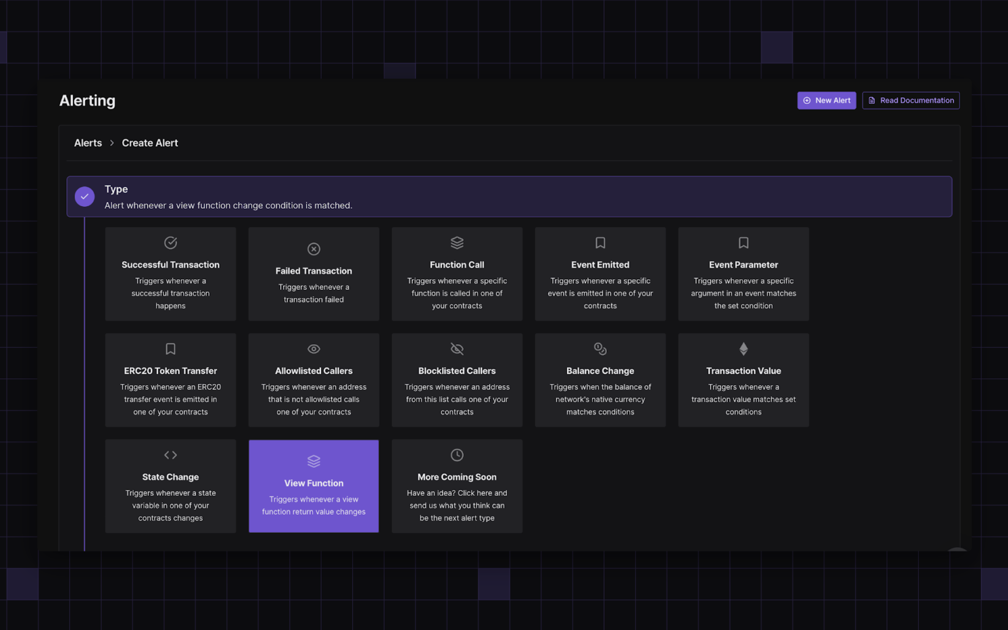 With Tenderly’s monitoring and alerting, you can monitor invariants in real time without writing a single line of code. Simply set up an alert based on the “View Function” trigger to check the invariant’s value every block.