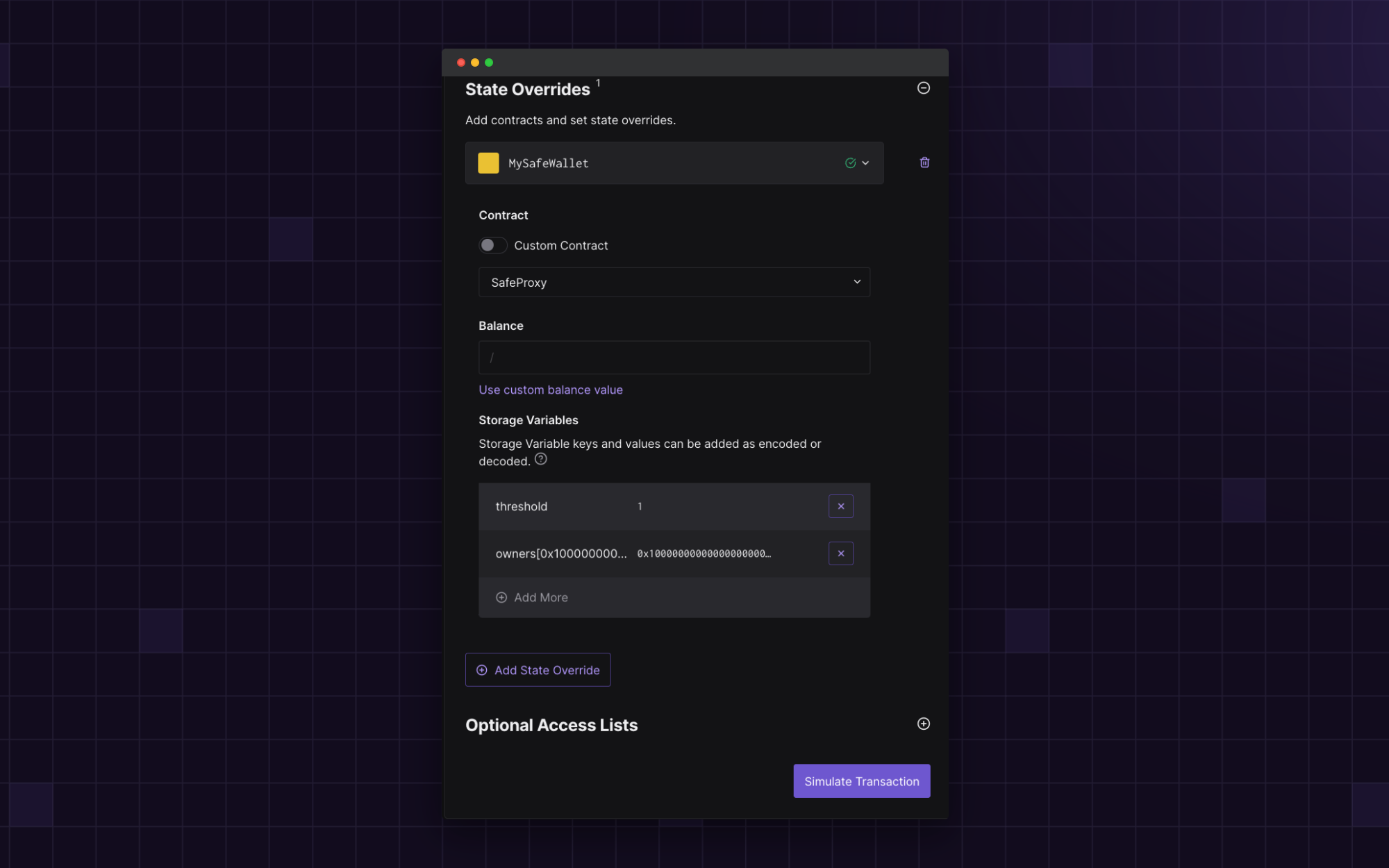 Normally, sending these assets requires multiple signatures from several wallet owners since Safe wallets are multisignature. However, you can bypass this requirement using state overrides when running a Tenderly simulation. This way, you can modify variables such as the signer threshold and the owner slot.