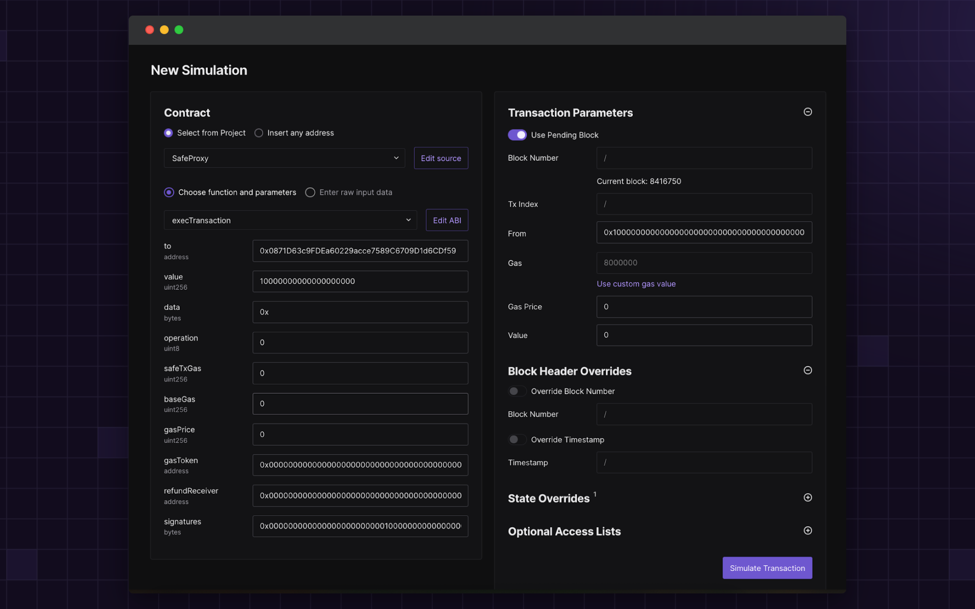 When approving and sending transactions in a Safe multisig wallet, you can first simulate them using Tenderly Transaction Simulator. This way, Safe enables you to run a transaction check, preview the execution, and analyze the expected outcome. To enable this, Safe integrated Tenderly’s simulations into their multisig wallet as the underlying infrastructure.