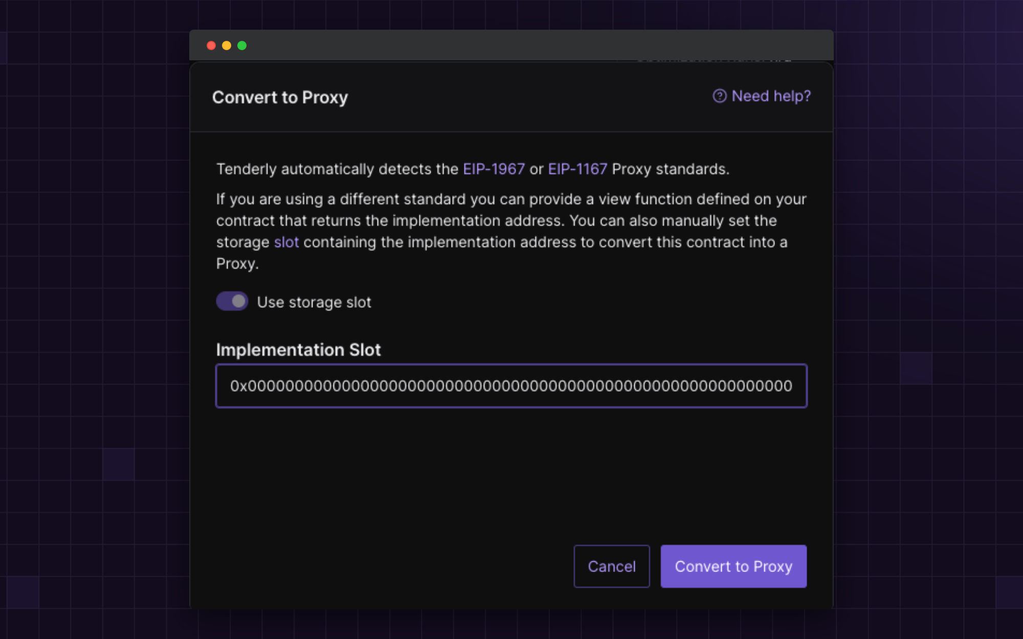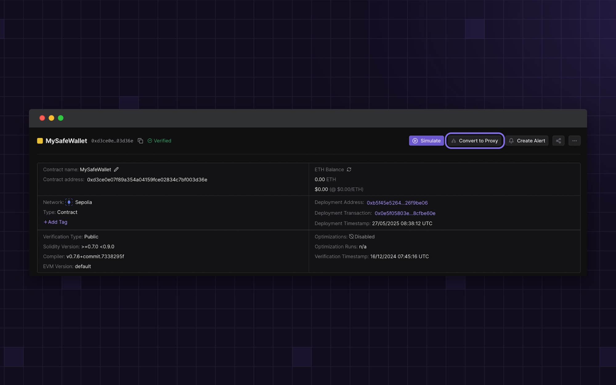 Next, link the SafeProxy contract to its implementation by clicking Convert to Proxy.