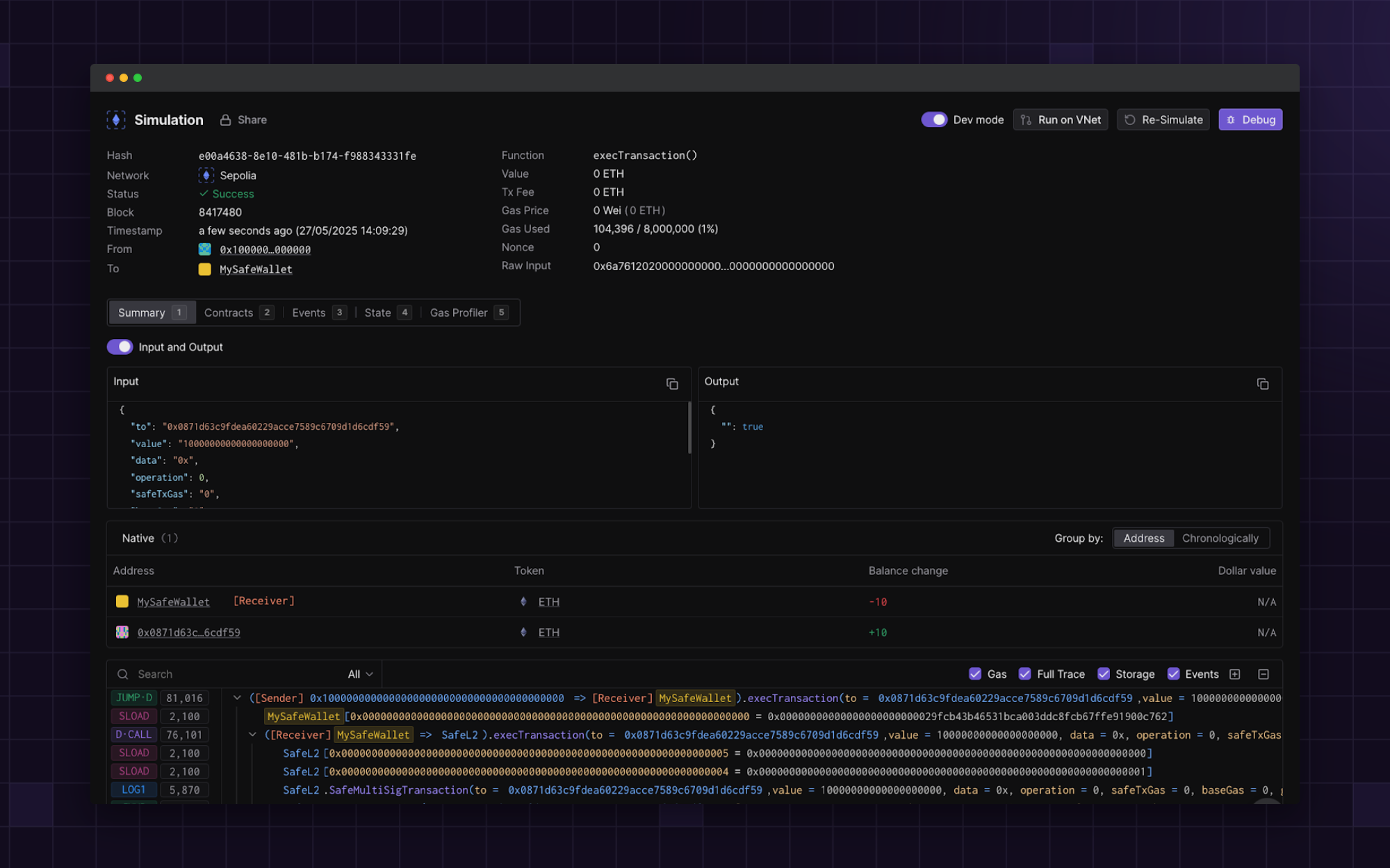 Finally, hit the Simulate Transaction button to run the simulation. If your simulation is successful, you should get a similar overview as the one below: