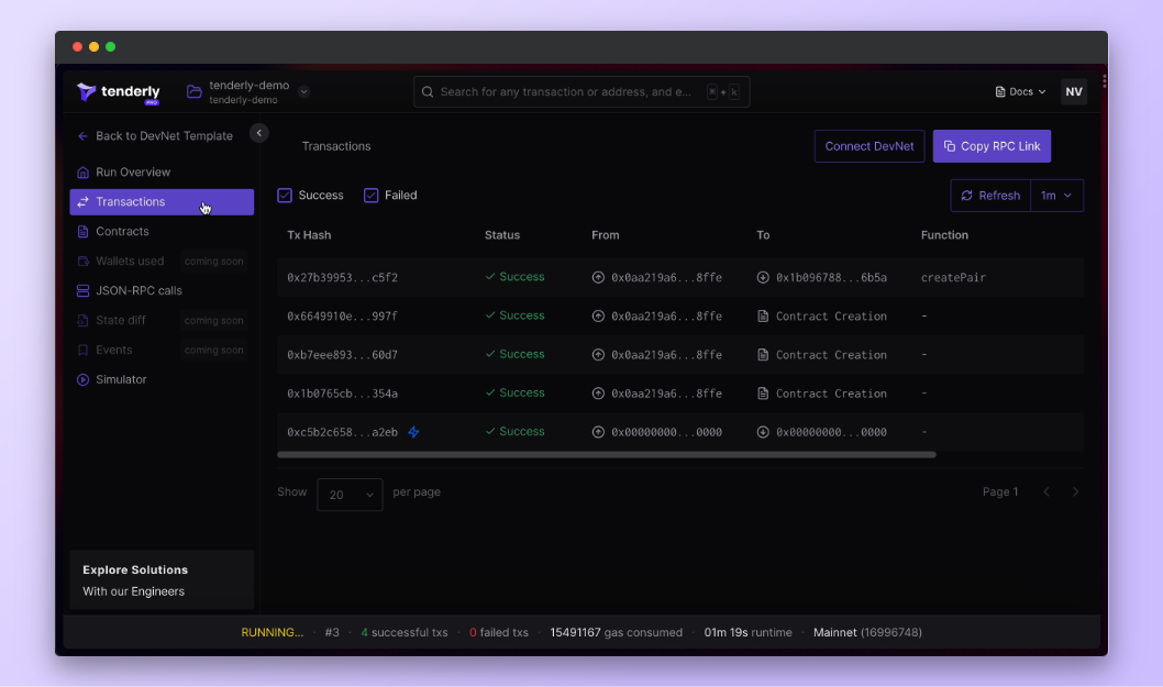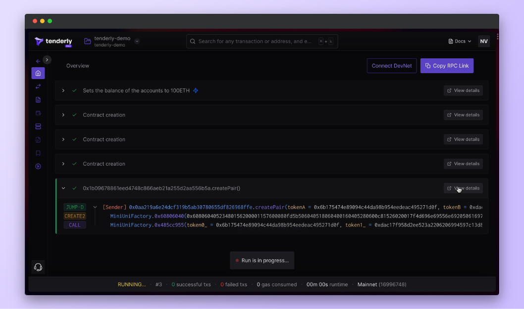 Using DevNets in your local development also means you’re no longer limited to just console logging when debugging. DevNets are fully integrated into Tenderly’s powerful development and debugging tools out of the box.